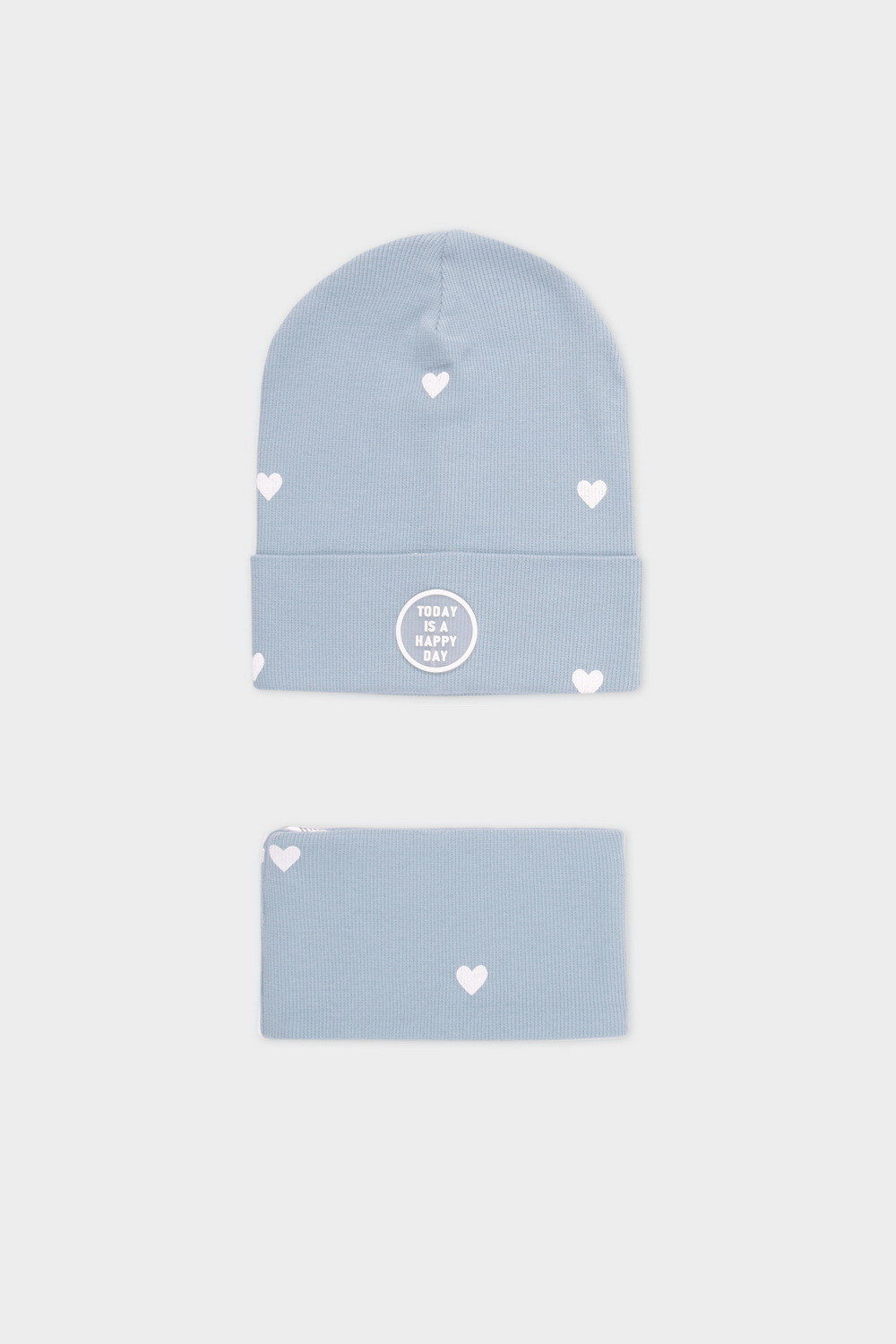 Комплект для девочки: шапка и снуд из хлопкового трикотажа в рубчик с добавлением эластана. Набивка выполнена из стойких гипоаллергенных красителей. Изделия хорошо тянутся, после многократных стирок сохраняют цвет и форму.