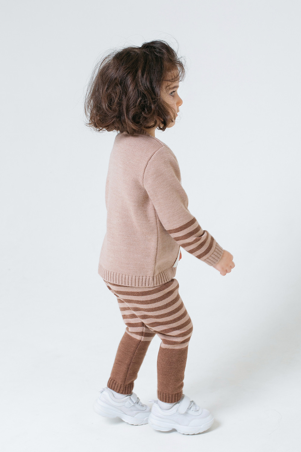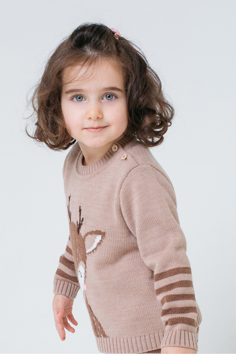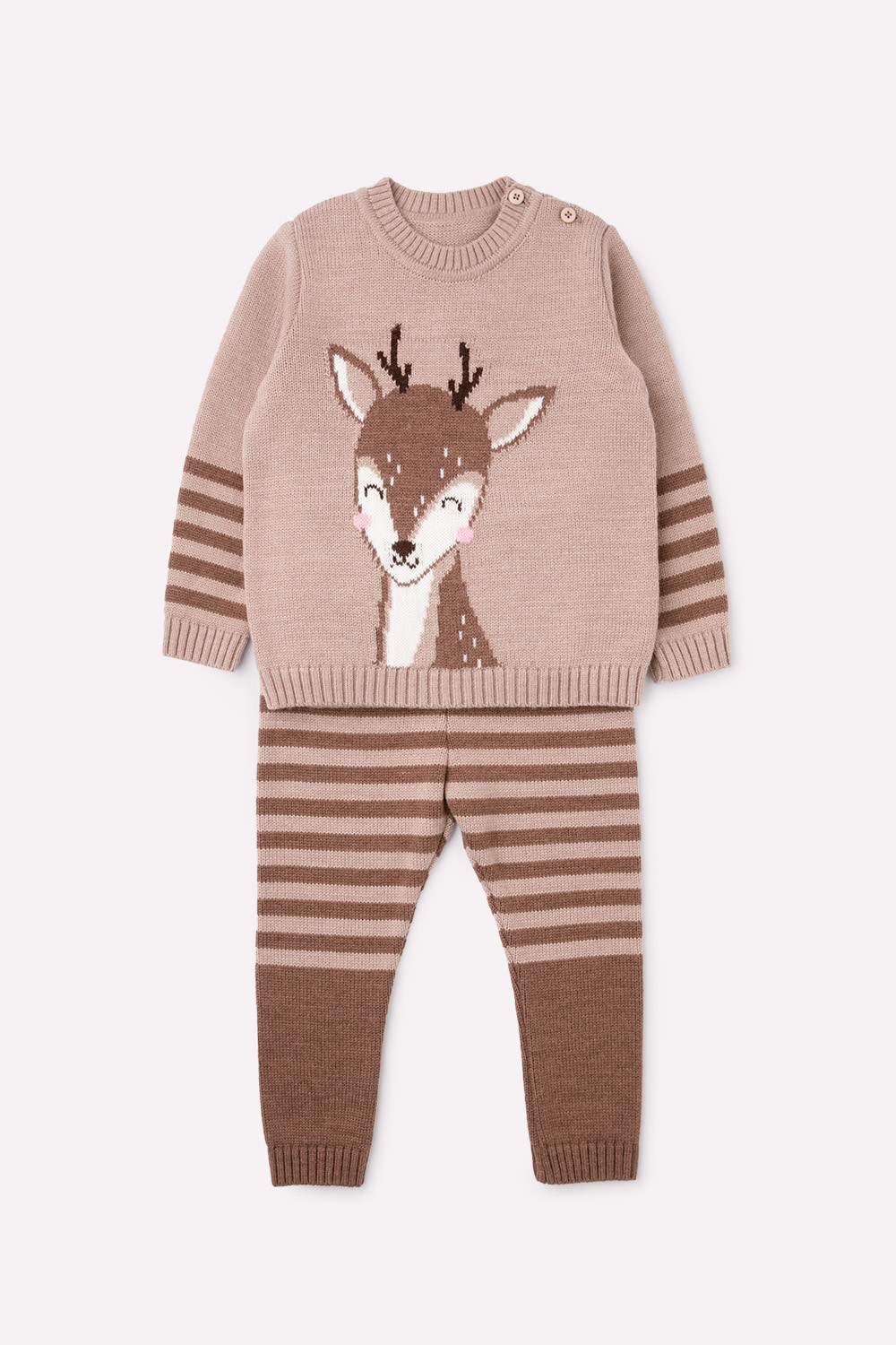 Бежевый вязаный комплект для девочки: джемпер с круглой горловиной и брюки. Украшен вывязанным узором с изображением оленёнка и полосками на рукавах и брюках. Горловина, манжеты и пояс связаны ластиком.
