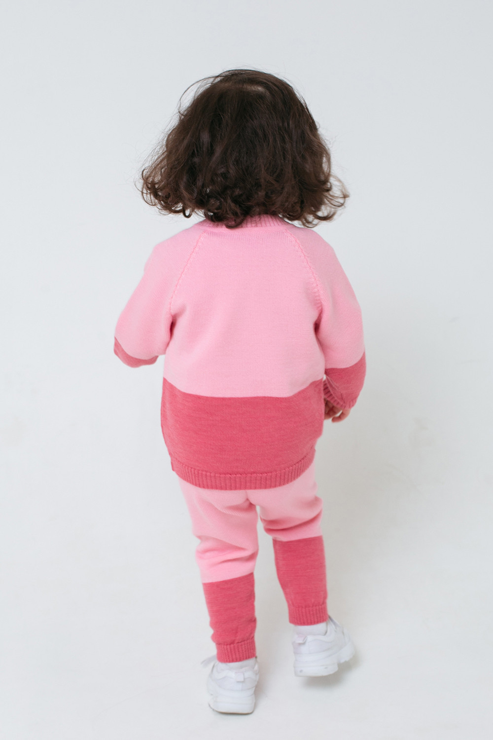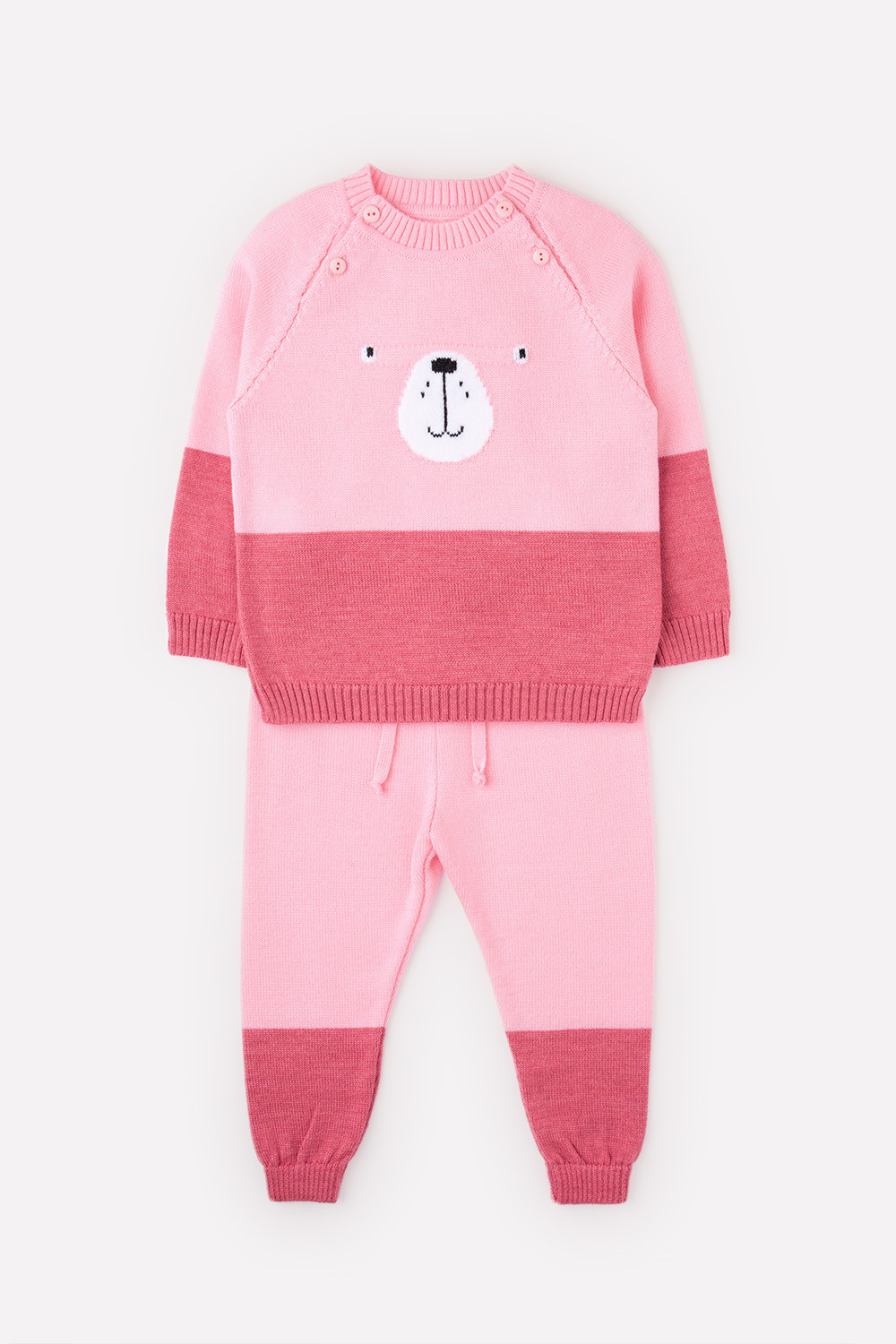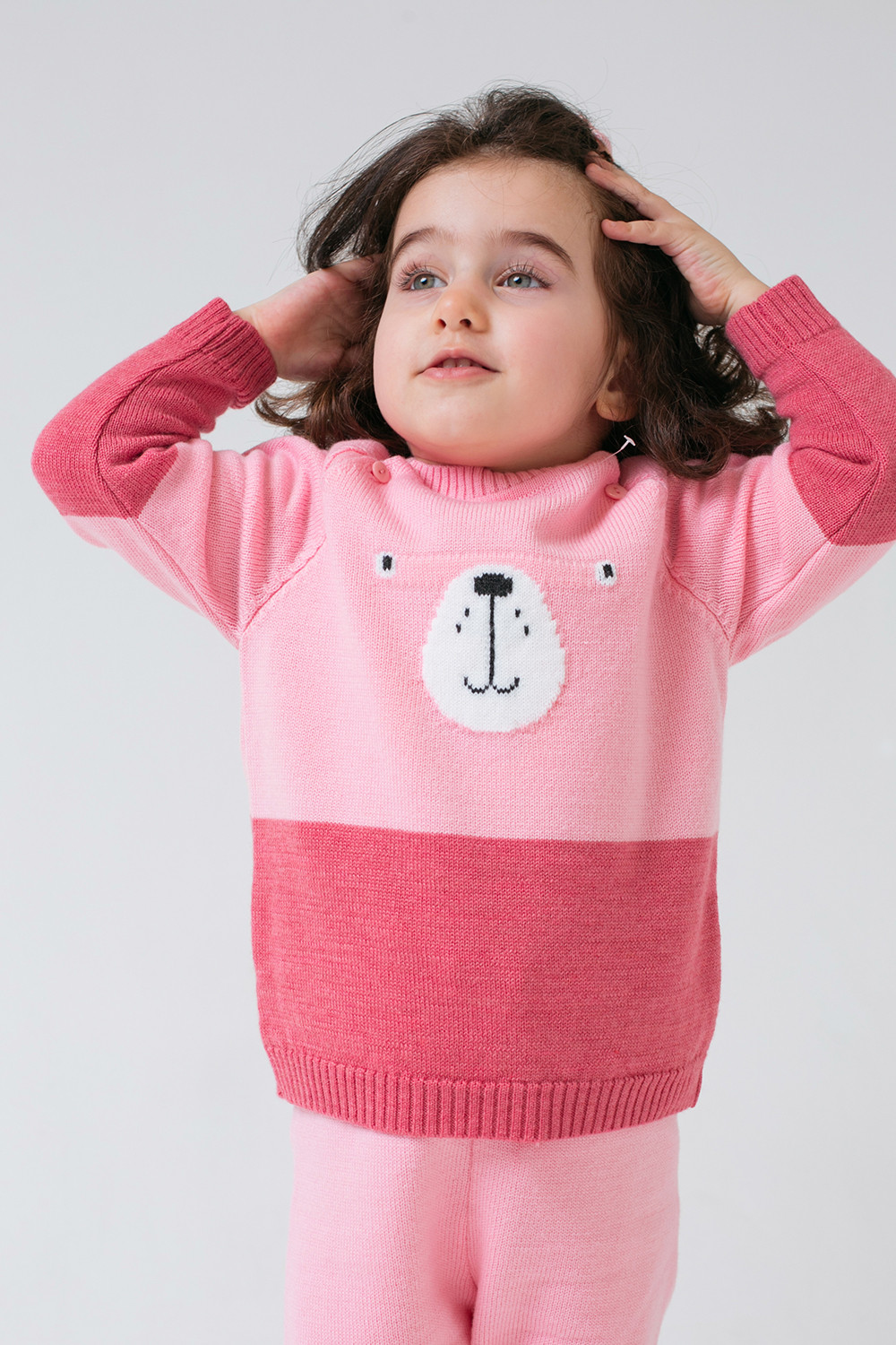 Вязаный комплект из полушерсти: джемпер с круглой горловиной и брюки. Украшен вывязанным узором с изображением мордочки медвежонка и широкими полосами. Джемпер застёгивается на пуговицы спереди на обоих плечах. Горловина, манжеты и пояс связаны ластиком. Ширина брюк регулируется с помощью вязаной ленточки.