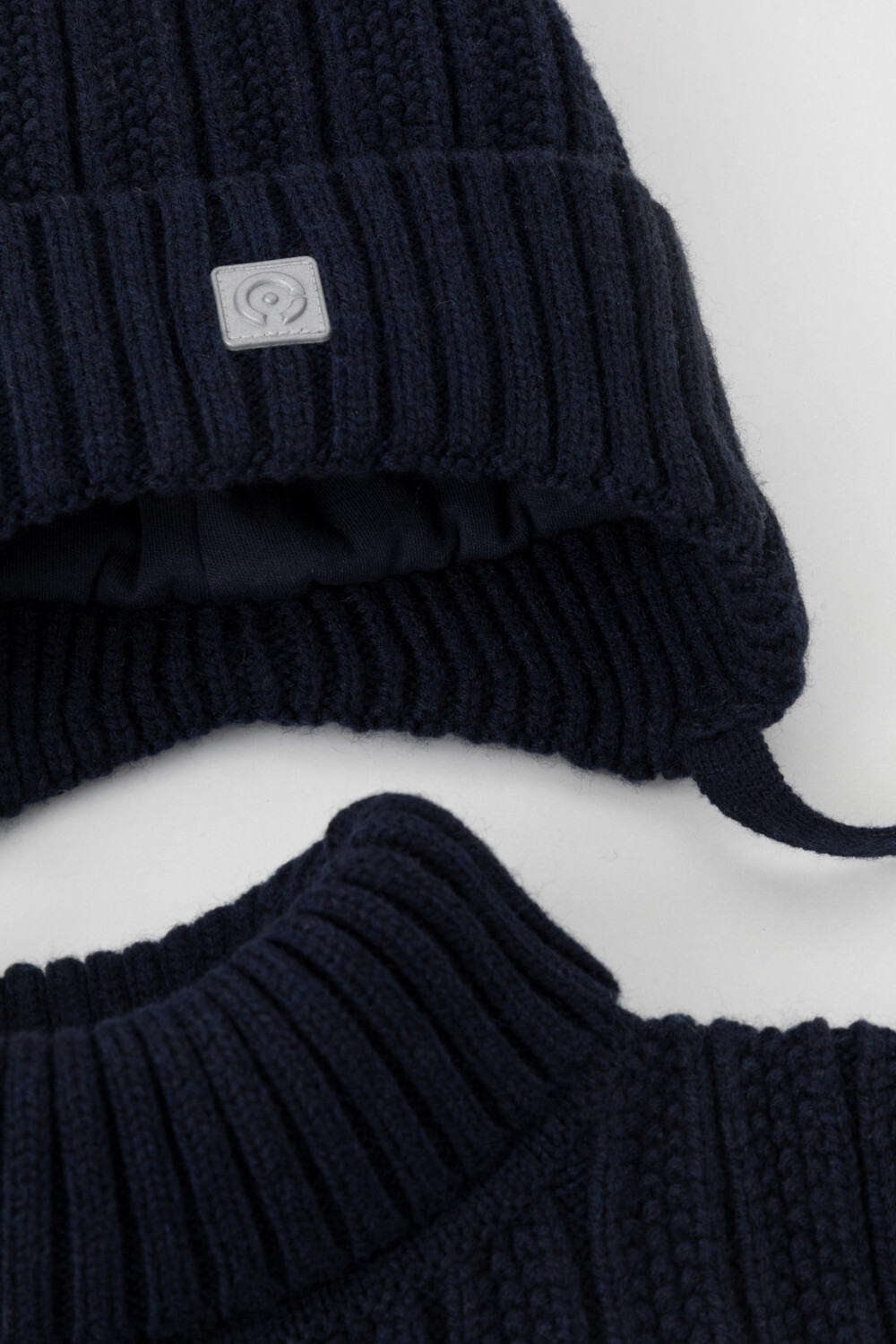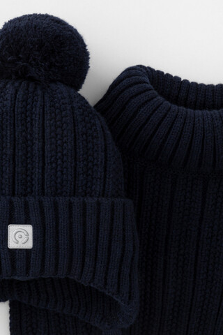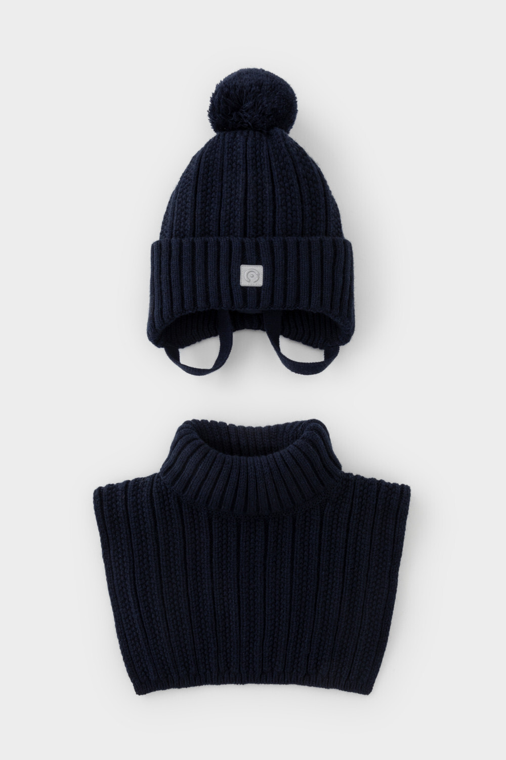 Комплект для мальчика: шапка и манишка из полушерстяной пряжи. Шапка на завязках с синтепоновым утеплителем. Подклад из натурального хлопка. Полностью закрывает голову, уши и шею, защищая ребёнка от холодного воздуха и ветра. На макушке помпон. Манишка с высоким воротником с эластичным отворотом.