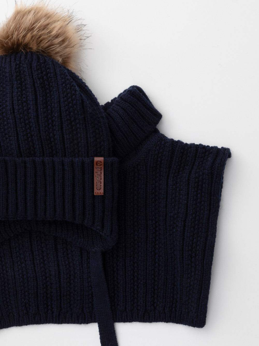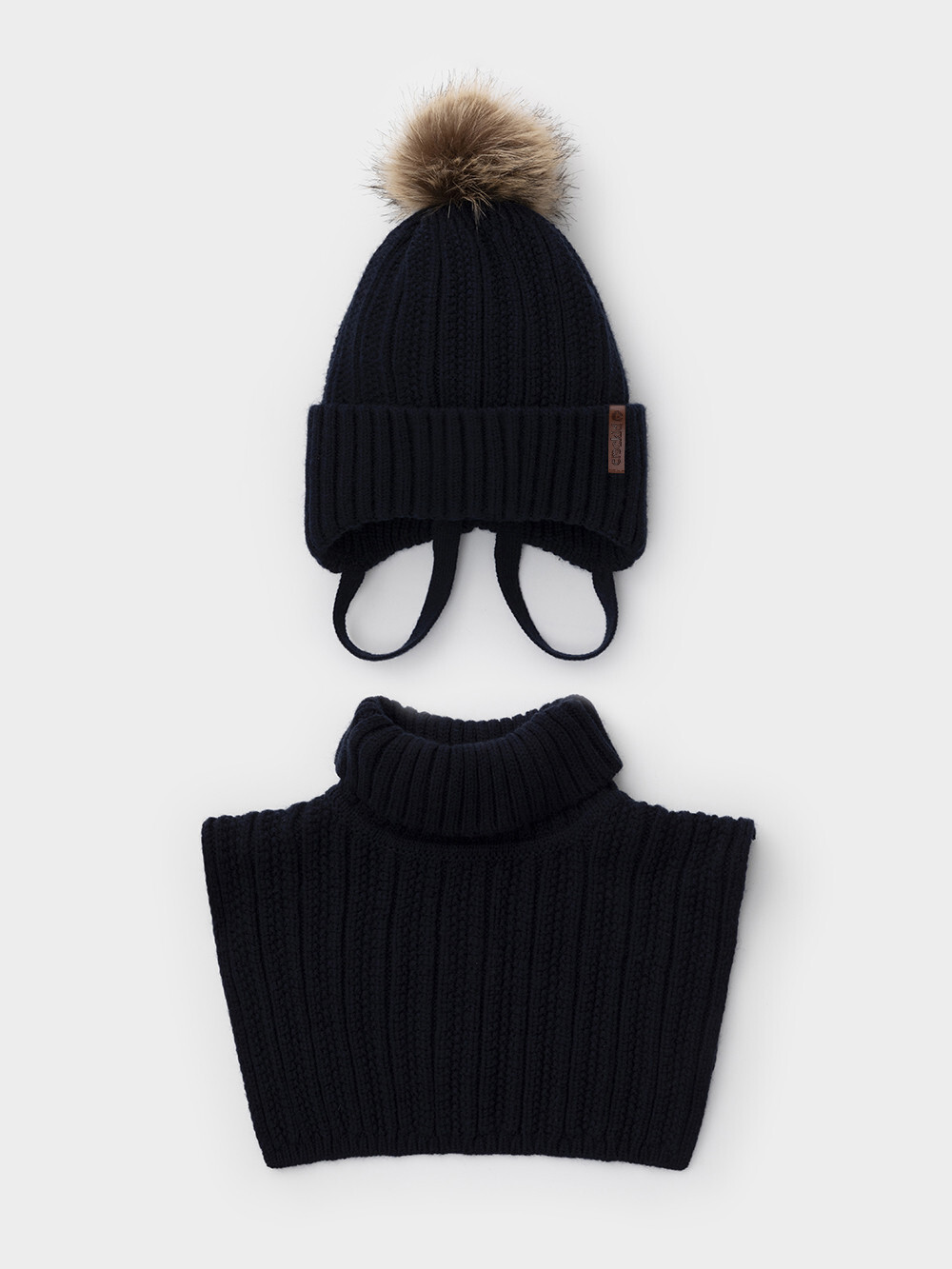 Комплект для мальчика: шапка и манишка из полушерстяной пряжи. Шапка на завязках с синтепоновым утеплителем. Подклад из натурального хлопка. Полностью закрывает голову, уши и шею, защищая ребёнка от холодного воздуха и ветра. На макушке помпон. Манишка с высоким воротником с эластичным отворотом.