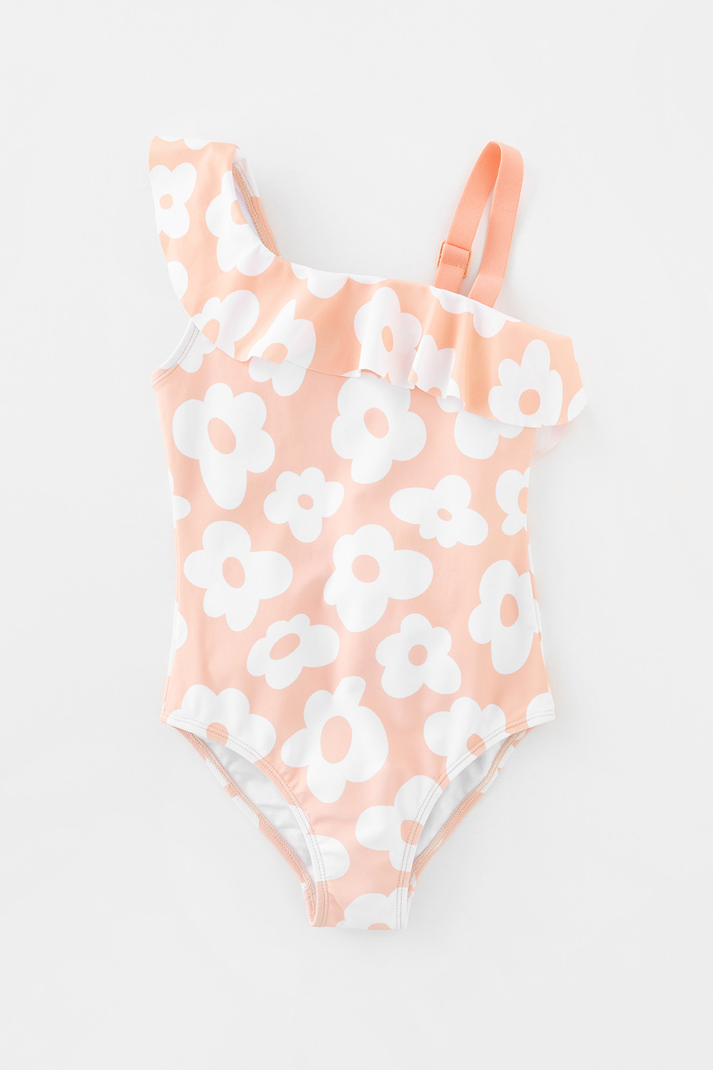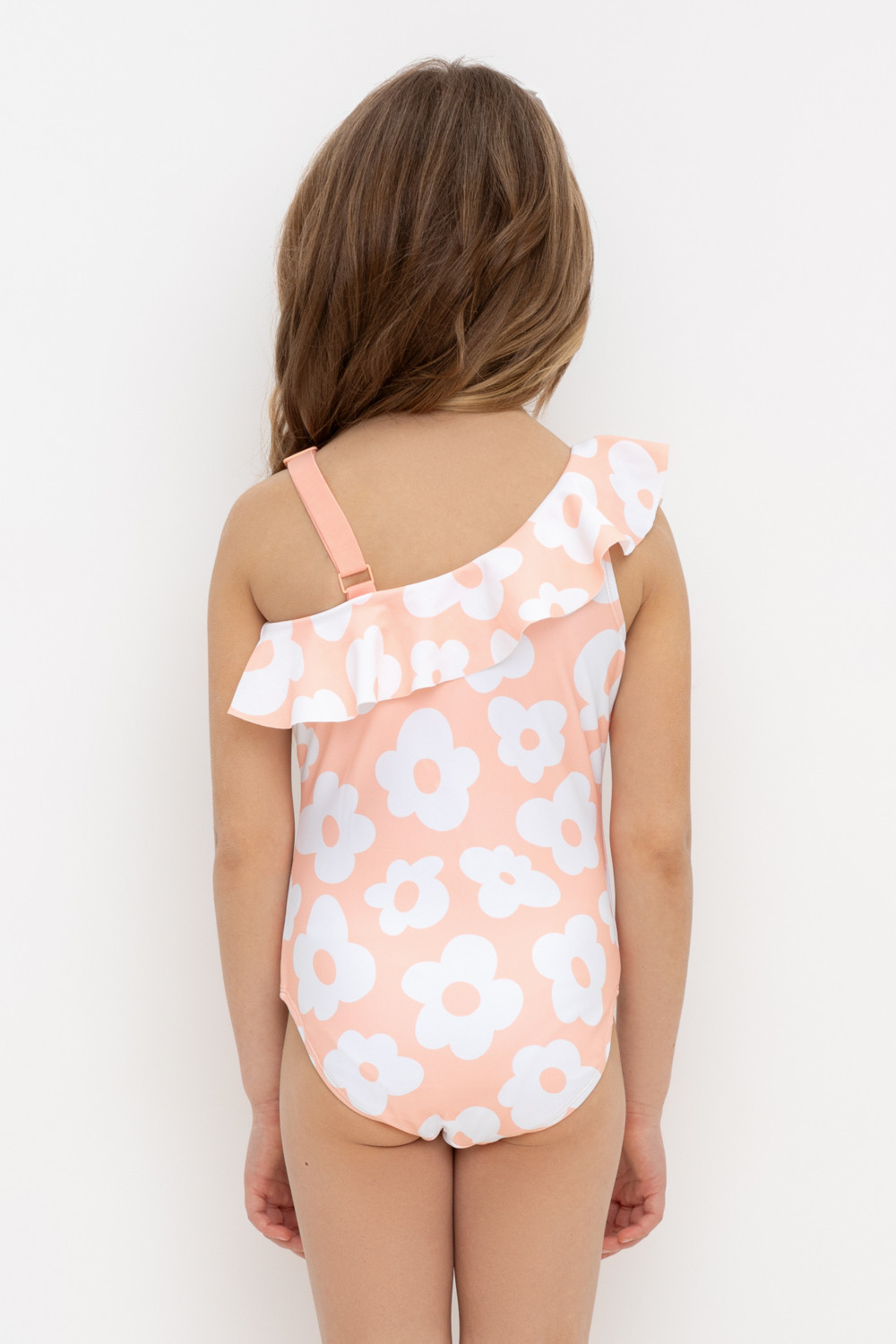 Слитный купальник на лямках для девочки. Украшен оборками. Оригинальная набивка выполнена из стойких гипоаллергенных красителей.