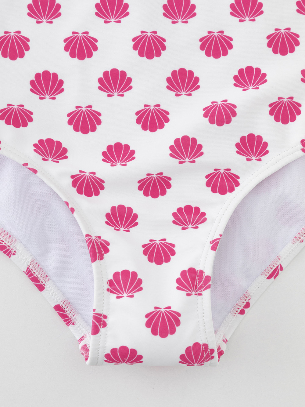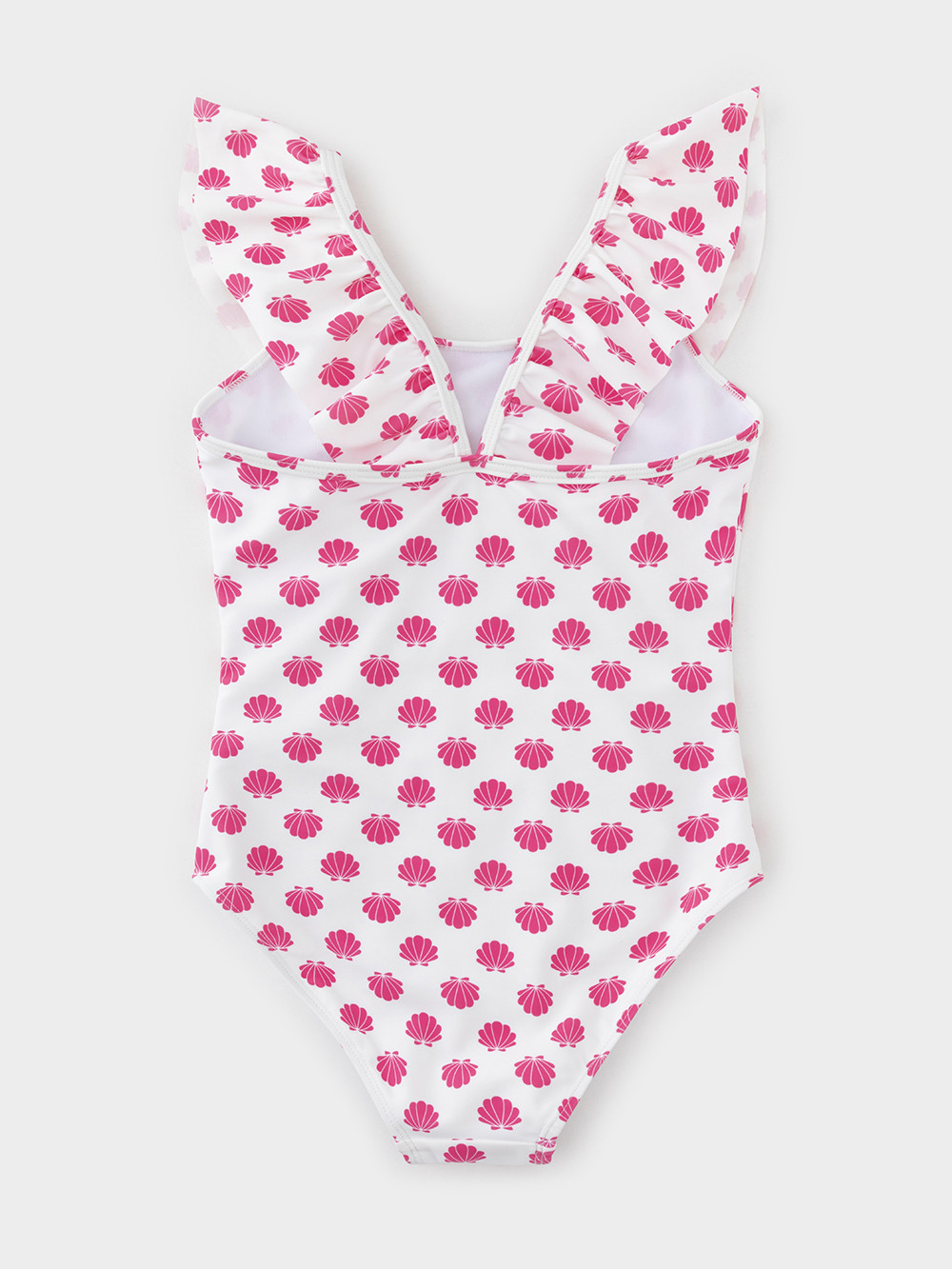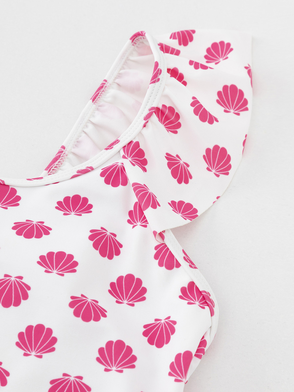 Слитный купальник на бретелях для девочки. Украшен оборками. Внутри подклад. Оригинальная набивка выполнена из стойких гипоаллергенных красителей.