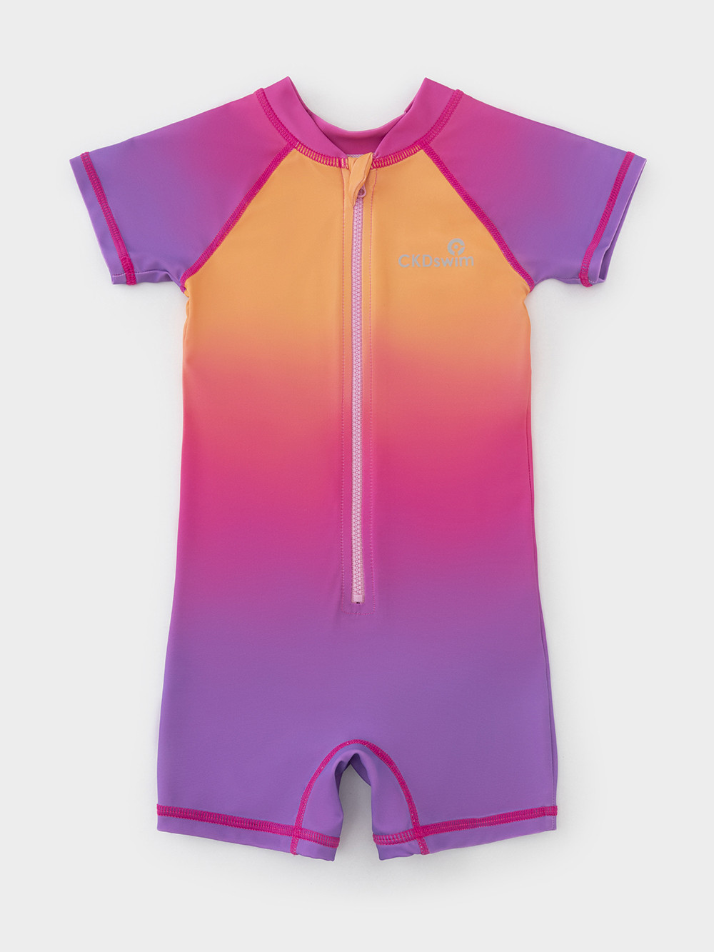 Купальник для девочки. Спереди застёгивается на молнию с мягкой защитой шеи и подбородка. Внутри подклад. Украшен светоотражающим принтом с логотипом. Оригинальная набивка выполнена из стойких гипоаллергенных красителей.