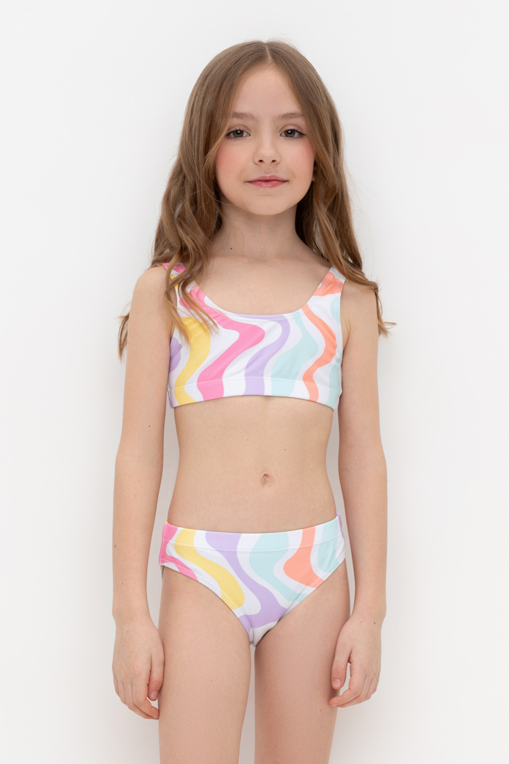 Раздельный купальник для девочки. Топ на эластичных лямках и плавки на резинке . Оригинальная набивка выполнена из стойких гипоаллергенных красителей.