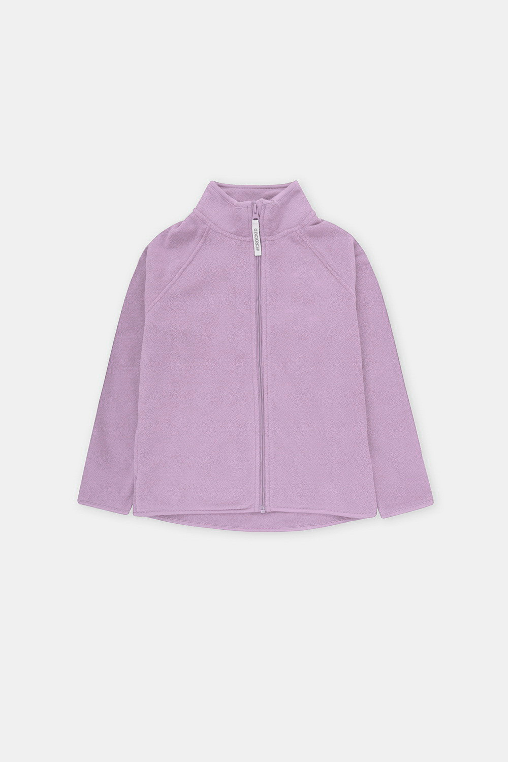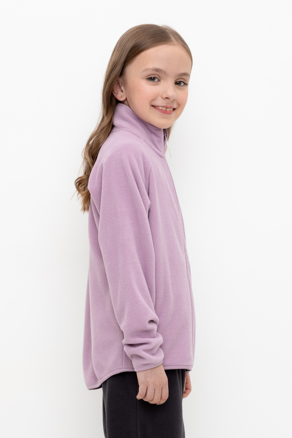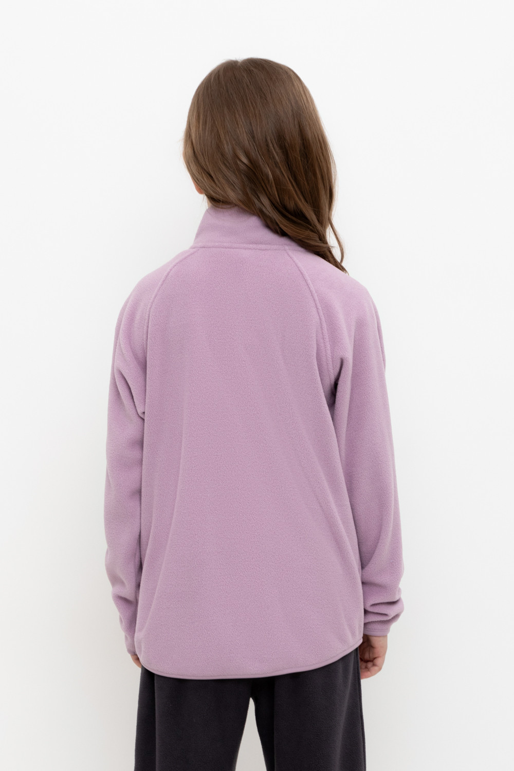 Флисовая куртка для девочки. У изделия удлинённая спинка, высокий воротник, предусмотрена защита шеи и подбородка. Рукава-реглан и низ изделия обработаны эластичным кантом для лучшего прилегания к телу, по бокам два кармана. Куртка сохраняет цвет и форму после многократных стирок.