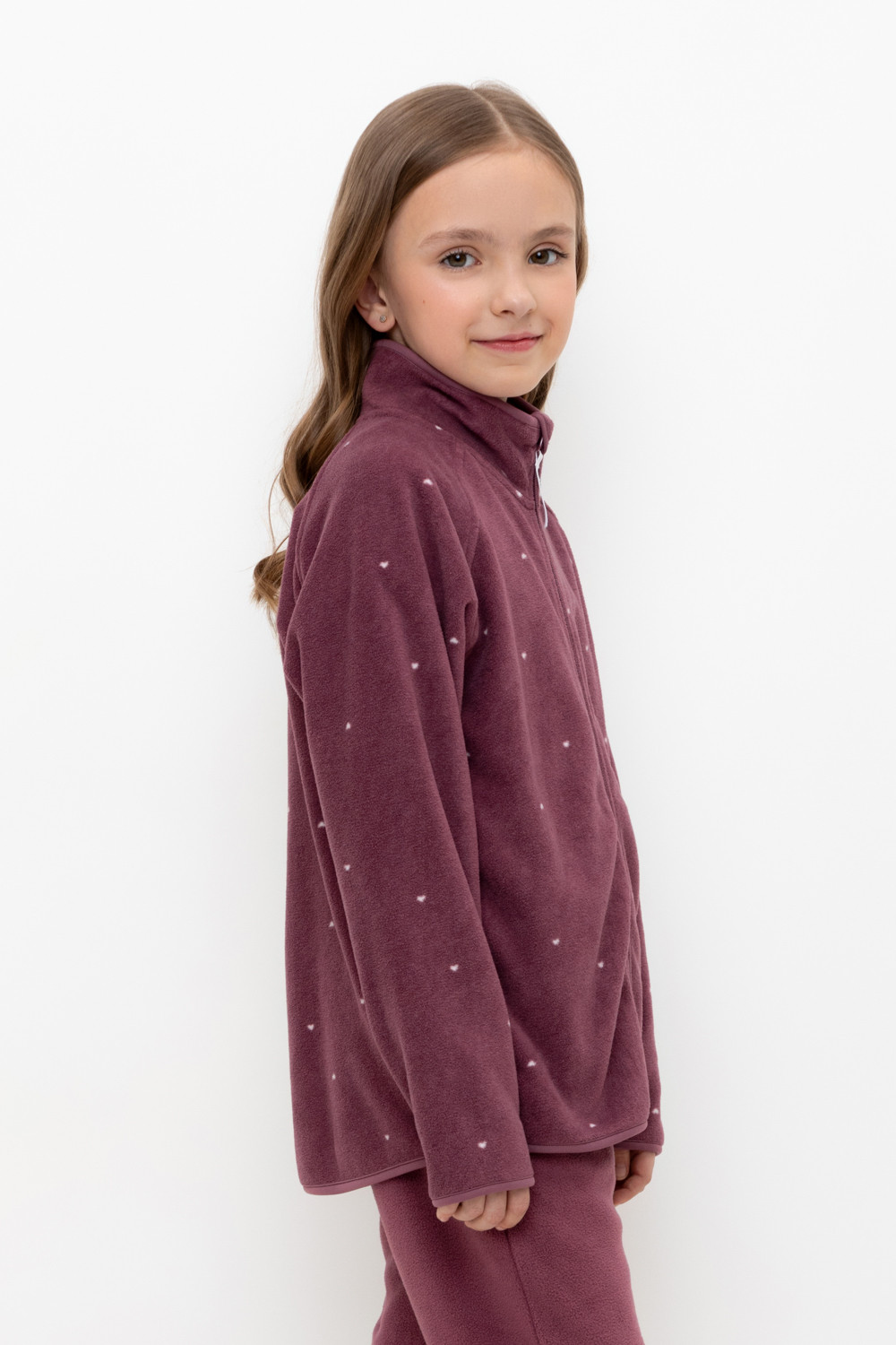 Флисовая куртка для девочки. У изделия удлинённая спинка, высокий воротник, предусмотрена защита шеи и подбородка. Рукава-реглан и низ изделия обработаны эластичным кантом для лучшего прилегания к телу, по бокам два кармана. Оригинальная набивка выполнена из стойких, гипоаллергенных текстильных красителей. Куртка сохраняет цвет и форму после многократных стирок.