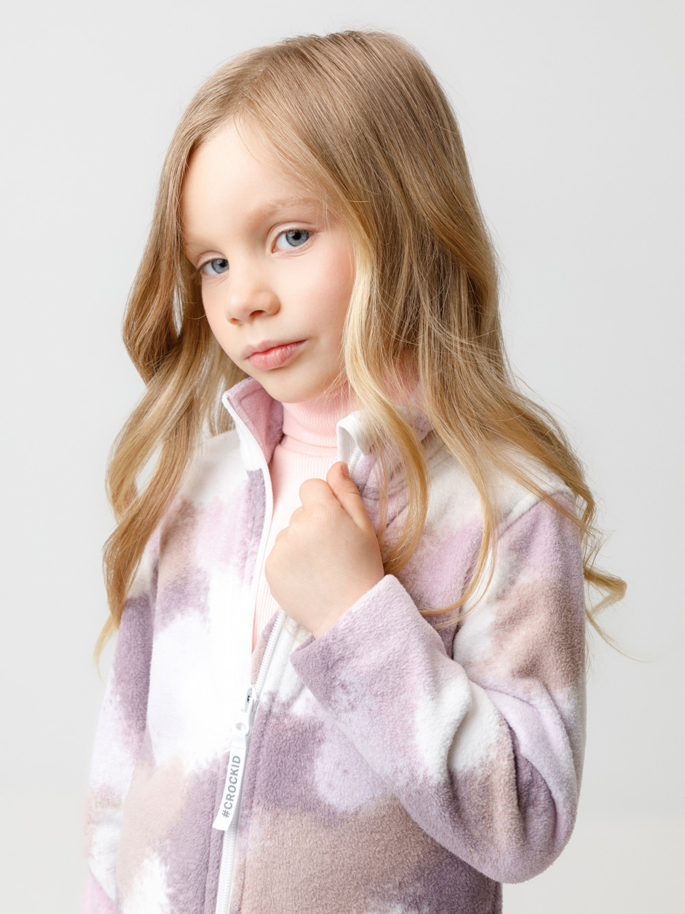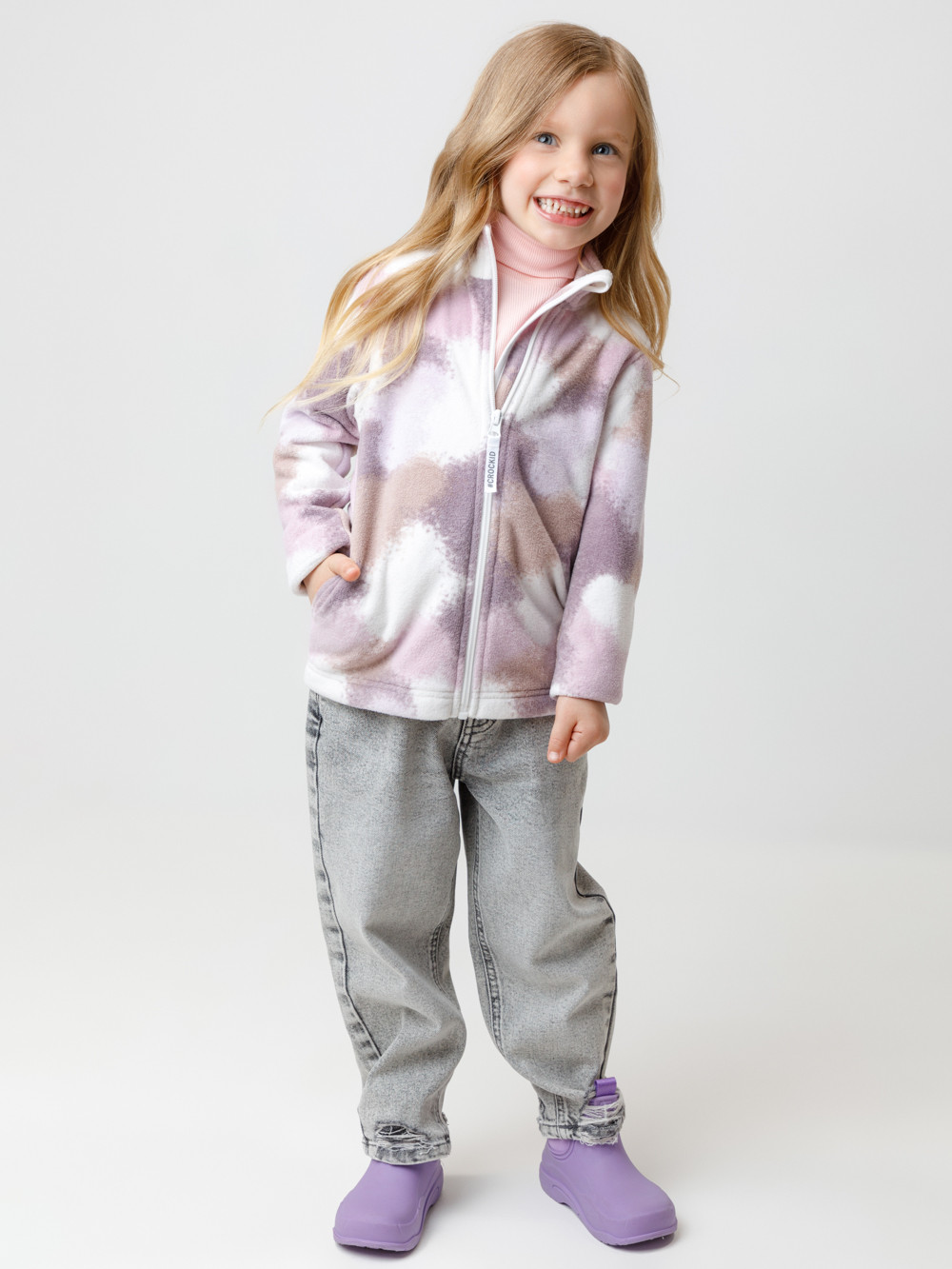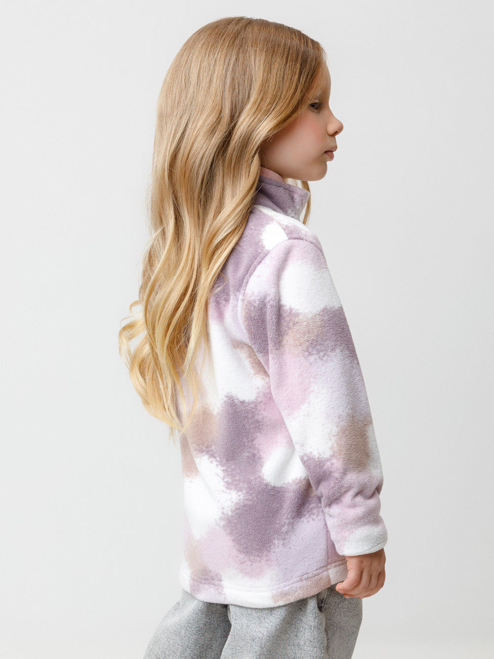 Флисовая куртка для девочки. У изделия высокий воротник и застёжка на молнию с мягкой защитой шеи и подбородка. По бокам два кармана. Оригинальная набивка выполнена из стойких гипоаллергенных текстильных красителей. Куртка сохраняет цвет и форму после многократных стирок.