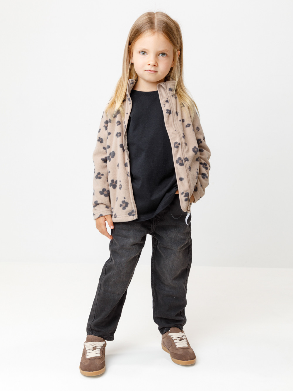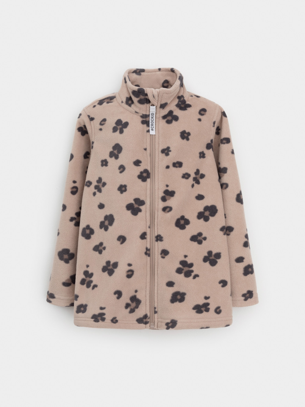 Флисовая куртка для девочки. У изделия высокий воротник и застёжка на молнию с мягкой защитой шеи и подбородка. По бокам два кармана. Оригинальная набивка выполнена из стойких гипоаллергенных текстильных красителей. Куртка сохраняет цвет и форму после многократных стирок.
