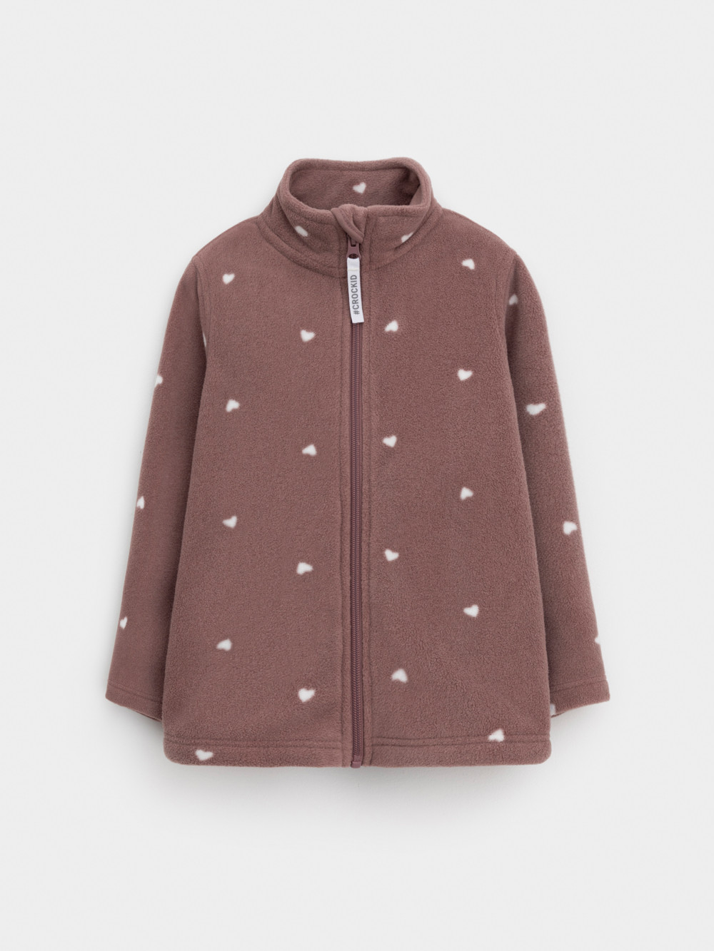 Флисовая куртка для девочки. У изделия высокий воротник и застёжка на молнию с мягкой защитой шеи и подбородка. По бокам два кармана. Оригинальная набивка выполнена из стойких гипоаллергенных текстильных красителей. Куртка сохраняет цвет и форму после многократных стирок.