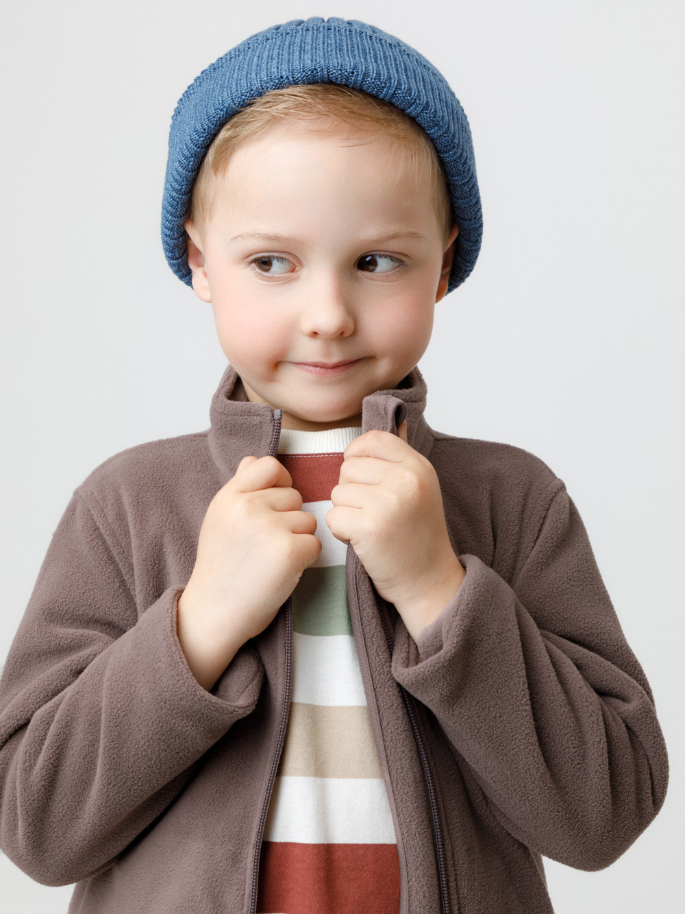 Флисовая куртка для мальчика. У изделия высокий воротник и застёжка на молнию с мягкой защитой шеи и подбородка. По бокам два кармана. Куртка сохраняет цвет и форму после многократных стирок.