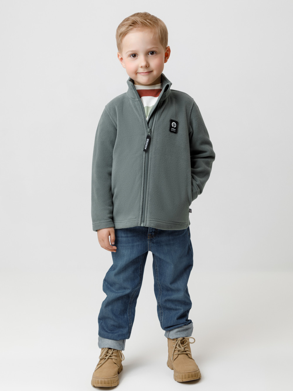 Флисовая куртка для мальчика. У изделия высокий воротник и застёжка на молнию с мягкой защитой шеи и подбородка. По бокам два кармана. Куртка сохраняет цвет и форму после многократных стирок.