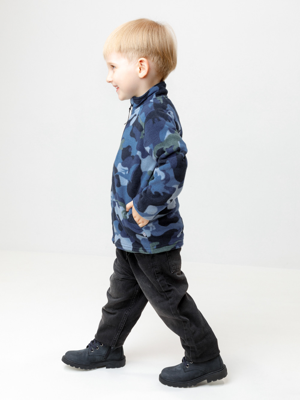 Флисовая куртка для мальчика. У изделия высокий воротник и застёжка на молнию с мягкой защитой шеи и подбородка. По бокам два кармана. Оригинальная набивка выполнена из стойких гипоаллергенных текстильных красителей. Куртка сохраняет цвет и форму после многократных стирок.