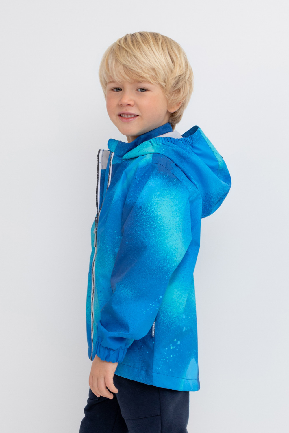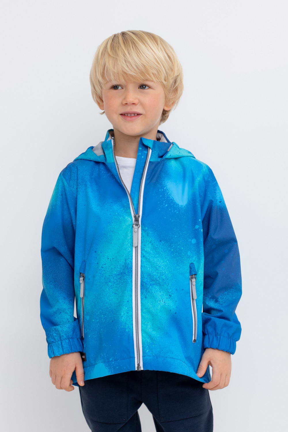 Ветровка для мальчика из мембранной ткани с дополнительной тефлоновой обработкой. Верхняя мембранная ткань 1000/1000 с тефлоновым покрытием отталкивает воду и грязь и обладает «дышащими» свойствами. Подкладка выполнена из 100% полиэстера. У изделия предусмотрена защита подбородка. Несъемный капюшон регулируется с помощью эластичного шнура со стопперами. Низ рукавов имеет эластичную резинку для лучшего прилегания. Во всех изделиях верхнего ассортимента для безопасности ребенка предусмотрены светоотражающие элементы