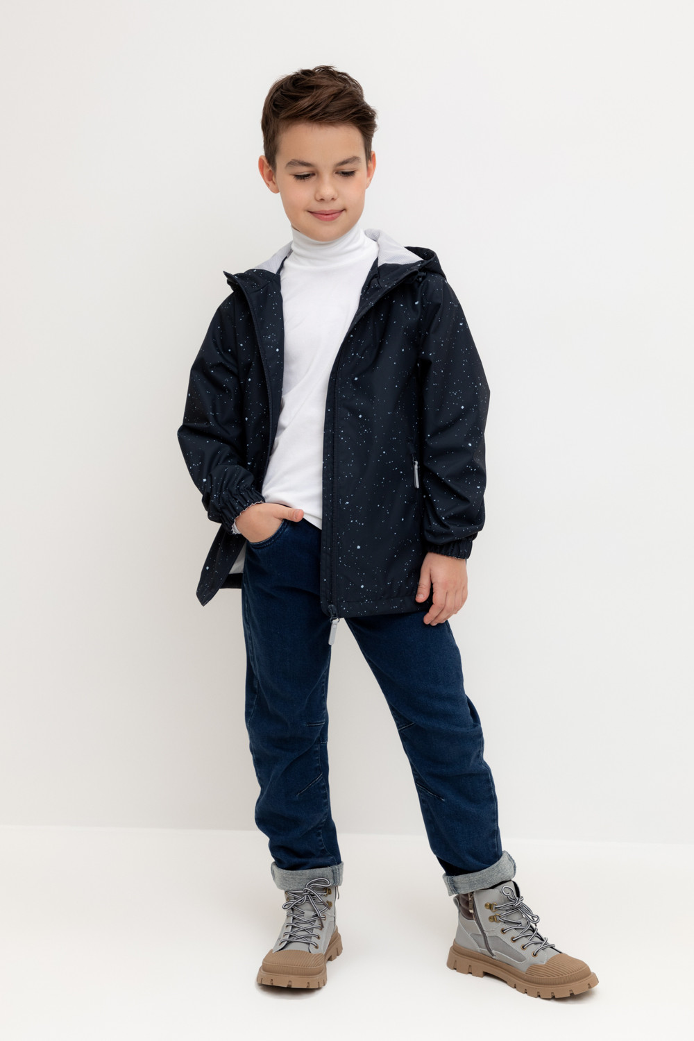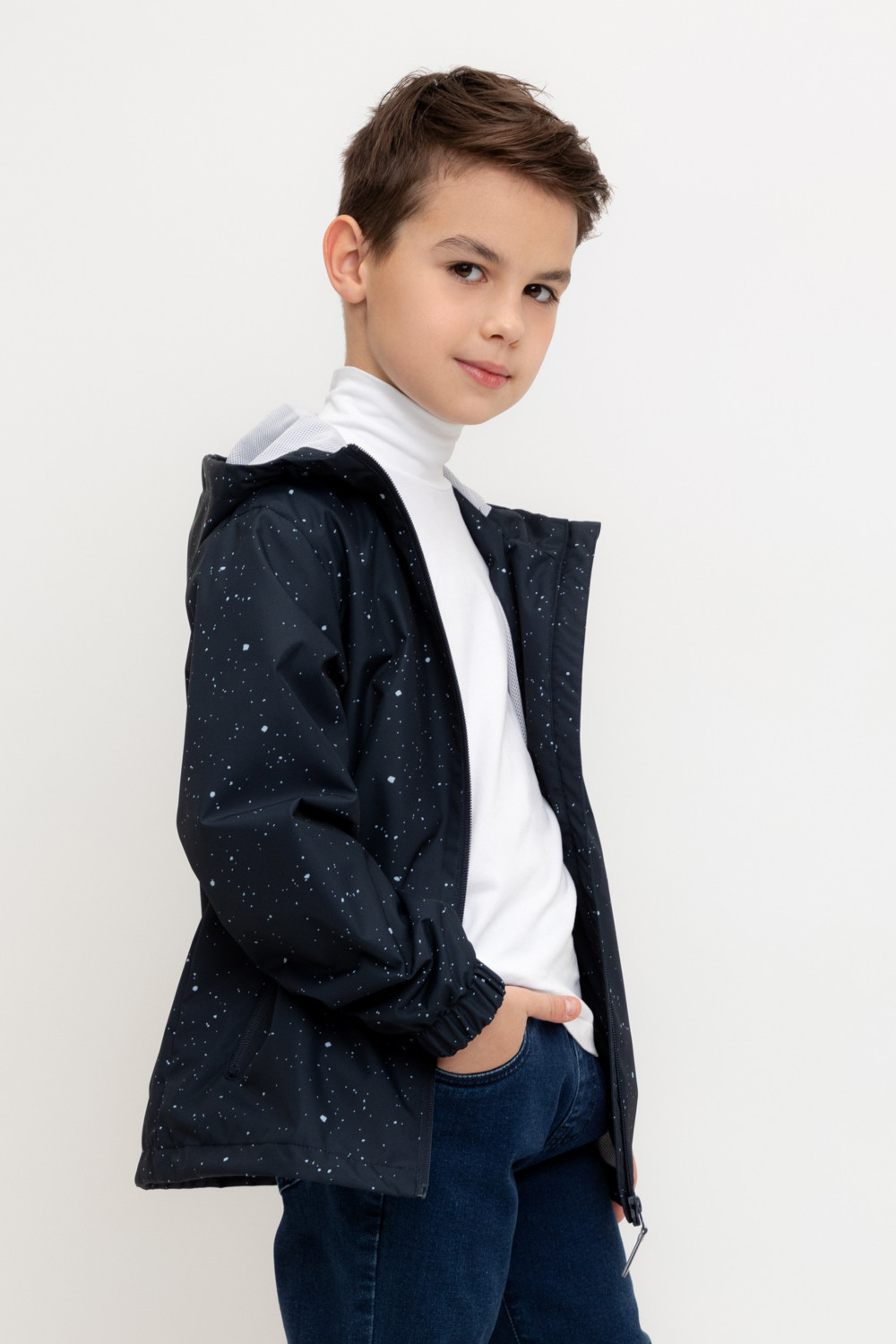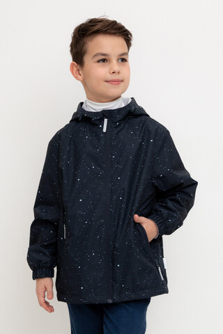Ветровка для мальчика из мембранной ткани с дополнительной тефлоновой обработкой. Верхняя мембранная ткань 1000/1000 с тефлоновым покрытием отталкивает воду и грязь и обладает «дышащими» свойствами. Подкладка выполнена из сетки, 100% полиэстер. У изделия предусмотрена защита подбородка. Несъемный капюшон утягивается с помощью регулирующего шнура со стопперами. На рукавах эластичные манжеты. Низ изделия регулируется эластичной утяжкой со стопперами. Во всех изделиях верхнего ассортимента для безопасности ребенка предусмотрены светоотражающие элементы.