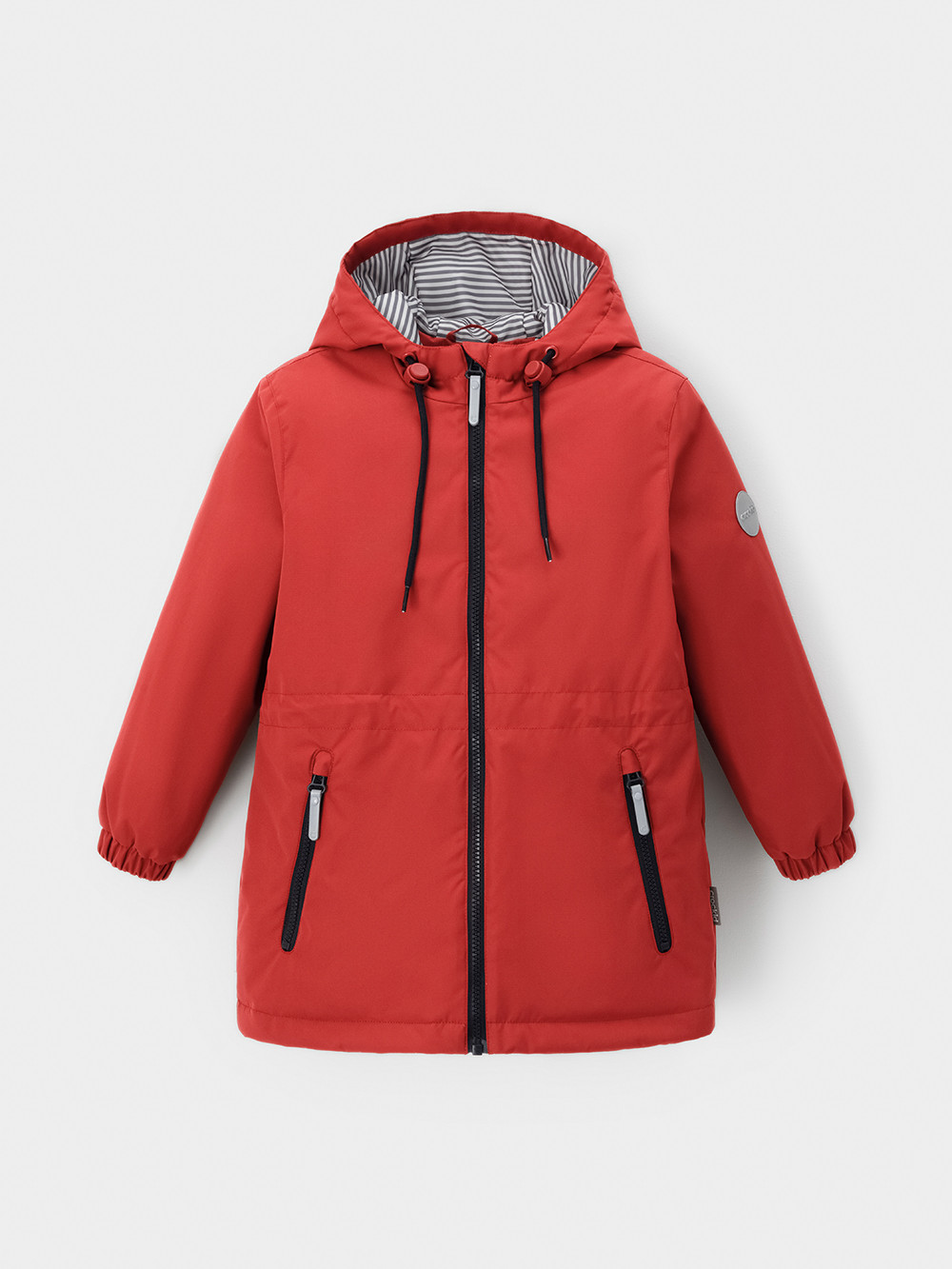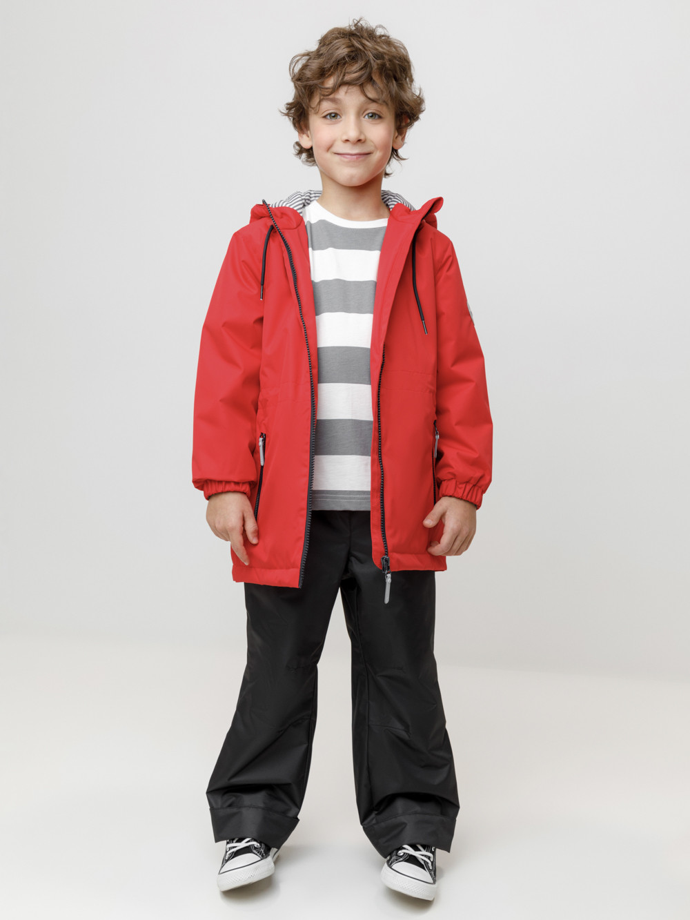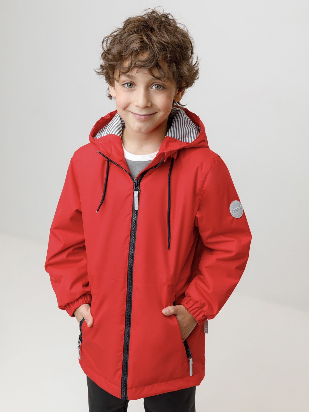 Демисезонная куртка для мальчика с утеплителем SEE: 120 г/м2. Выполнена из мембранной ткани с тефлоновой обработкой. Данный вид обработки предохраняет изделие от загрязнения и хорошо отталкивает влагу. Подклад выполнен из 100% полиэстера. Куртка застёгивается на молнию, предусмотрена защита подбородка. Несъёмный капюшон имеет утяжку на шнур со стопперами по бокам. Низ рукавов на эластичной резинке. По талии эластичная утяжка со стопперами. По бокам два кармана на молниях. Во всех изделиях верхнего ассортимента для безопасности ребёнка предусмотрены светоотражающие элементы.