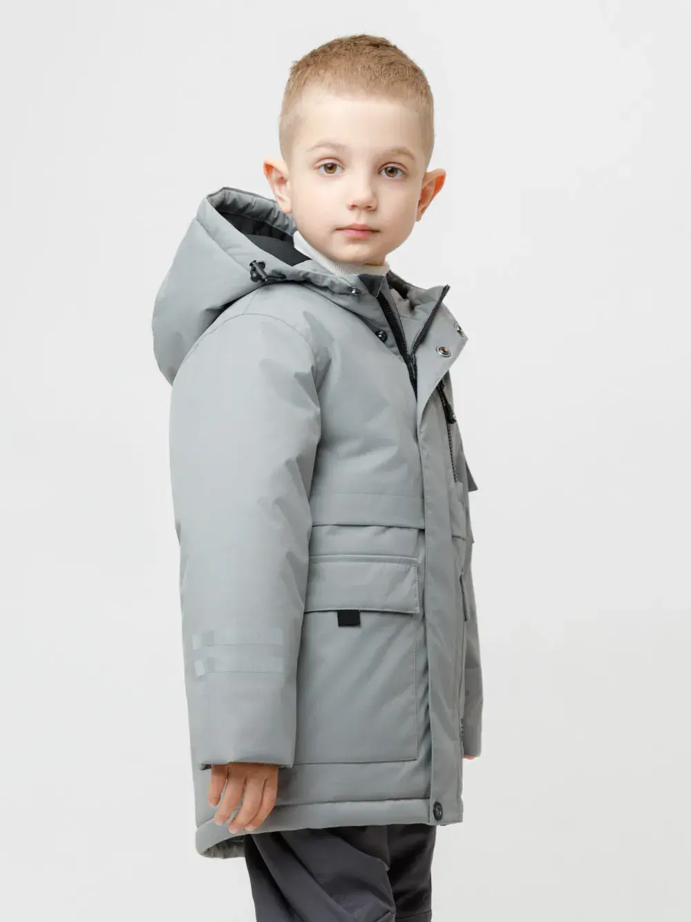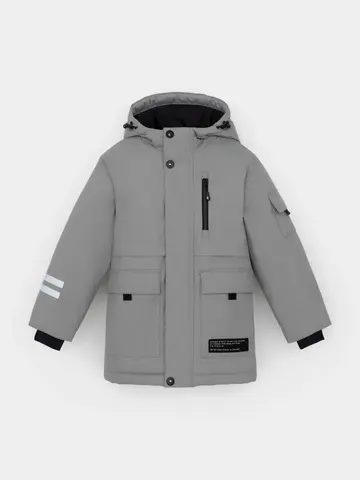 Зимняя куртка для мальчика с утеплителем SEE®: 250 г/м2. Выполнена из мембранной ткани с дополнительной тефлоновой обработкой, которая предохраняет изделие от загрязнений и отталкивает влагу. Подклад выполнен из 100% полиэстера Tricot. Куртка застёгивается на молнию и на дополнительную планку с кнопками. У изделия предусмотрена защита подбородка. Несъёмный капюшон имеет эластичную утяжку со стопперами, глубина капюшона регулируется при помощи липучки. На рукавах внутренние эластичные манжеты. Два накладных кармана с клапанами по бокам и один карман на груди. Во всех изделиях верхнего ассортимента для безопасности ребёнка предусмотрены светоотражающие элементы.