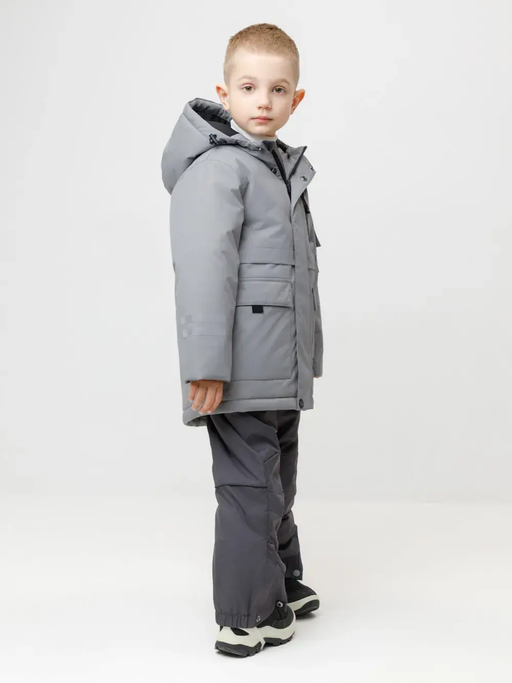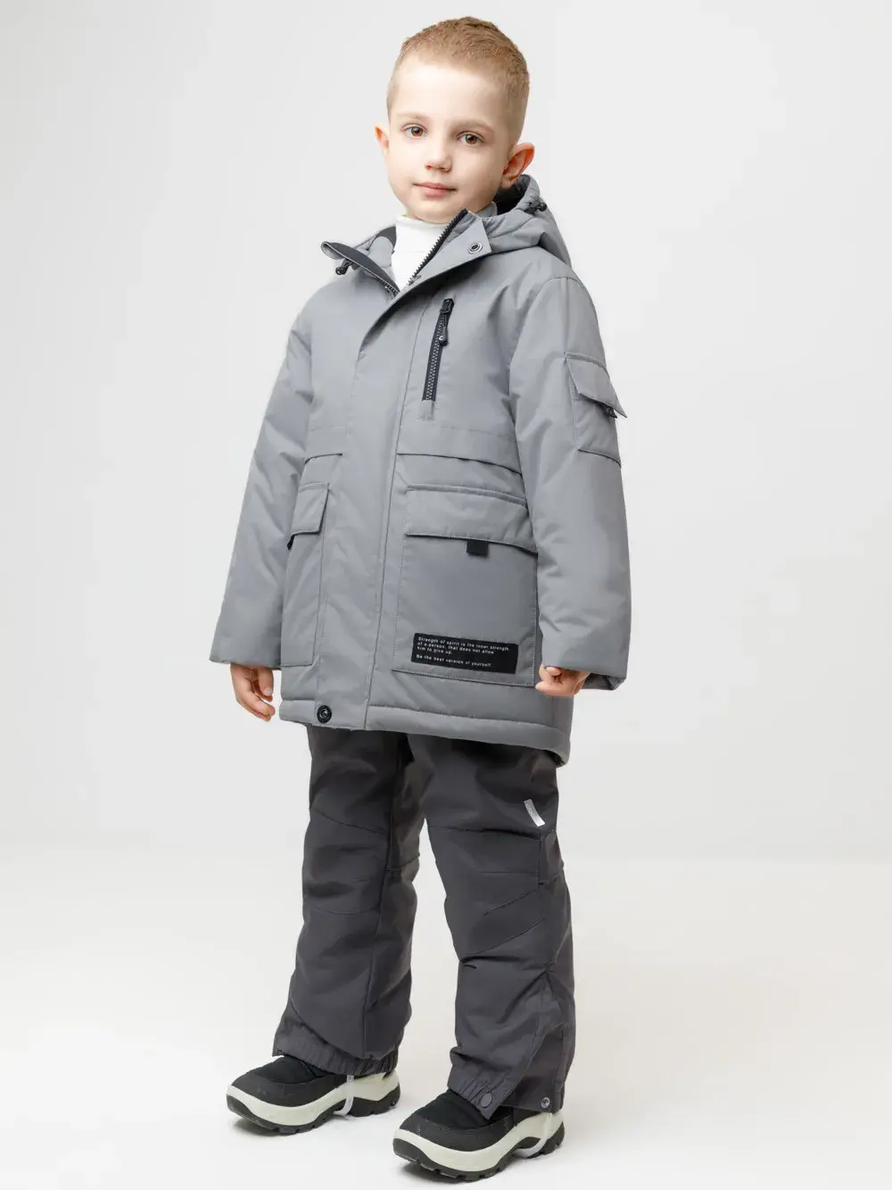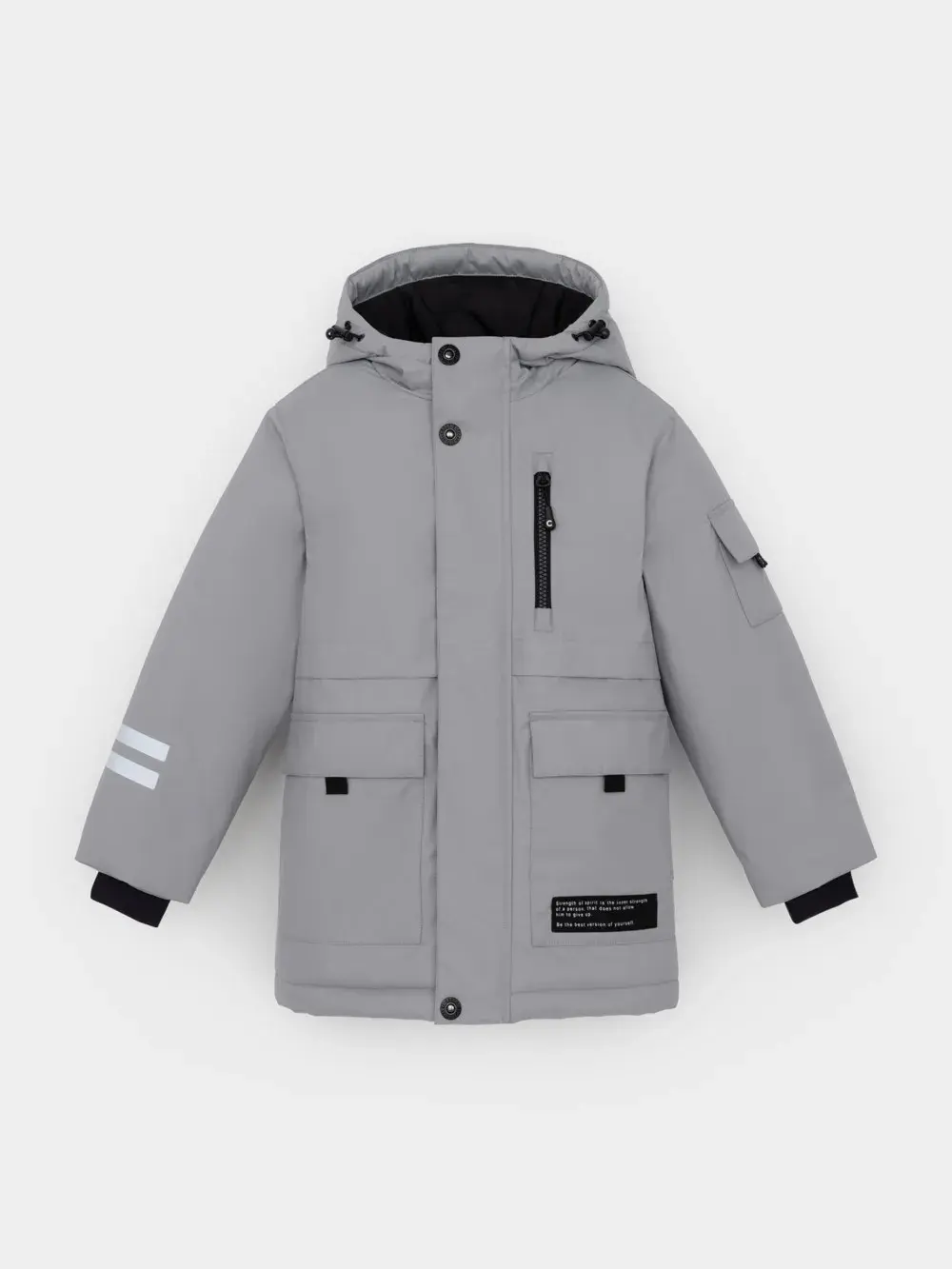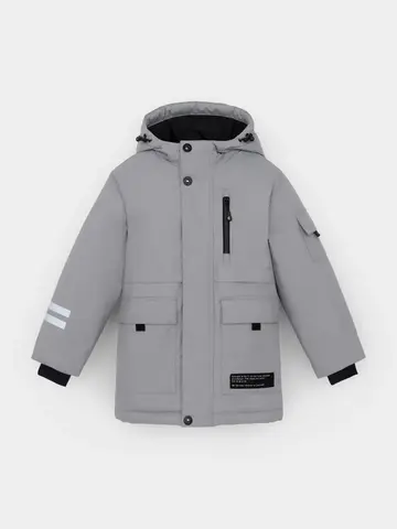 Зимняя куртка для мальчика с утеплителем SEE®: 250 г/м2. Выполнена из мембранной ткани с дополнительной тефлоновой обработкой, которая предохраняет изделие от загрязнений и отталкивает влагу. Подклад выполнен из 100% полиэстера Tricot. Куртка застёгивается на молнию и на дополнительную планку с кнопками. У изделия предусмотрена защита подбородка. Несъёмный капюшон имеет эластичную утяжку со стопперами, глубина капюшона регулируется при помощи липучки. На рукавах внутренние эластичные манжеты. Два накладных кармана с клапанами по бокам и один карман на груди. Во всех изделиях верхнего ассортимента для безопасности ребёнка предусмотрены светоотражающие элементы.