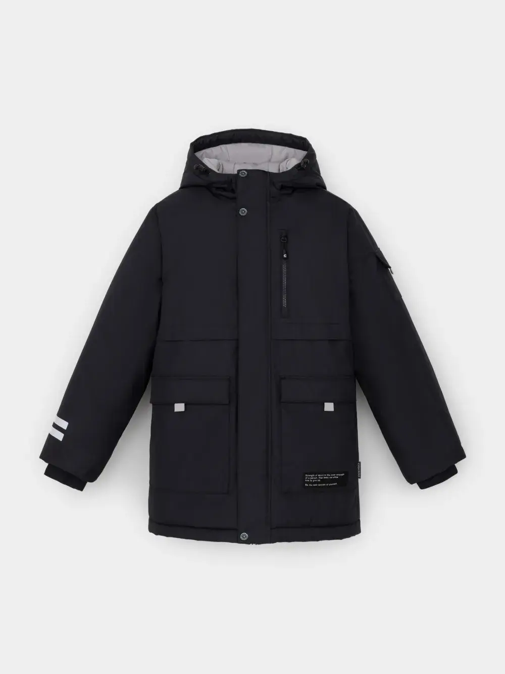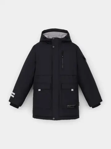 Зимняя куртка для мальчика с утеплителем SEE®: 250 г/м2. Выполнена из мембранной ткани с дополнительной тефлоновой обработкой, которая предохраняет изделие от загрязнений и отталкивает влагу. Подклад выполнен из 100% полиэстера Tricot. Куртка застёгивается на молнию и на дополнительную планку с кнопками. У изделия предусмотрена защита подбородка. Несъёмный капюшон имеет эластичную утяжку со стопперами, глубина капюшона регулируется при помощи липучки. На рукавах внутренние эластичные манжеты. Два накладных кармана с клапанами по бокам и один карман на груди. Во всех изделиях верхнего ассортимента для безопасности ребёнка предусмотрены светоотражающие элементы.