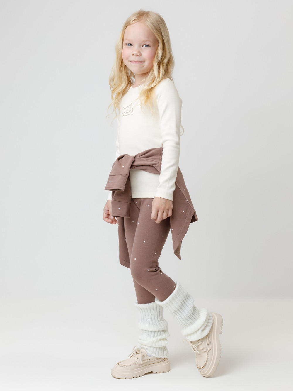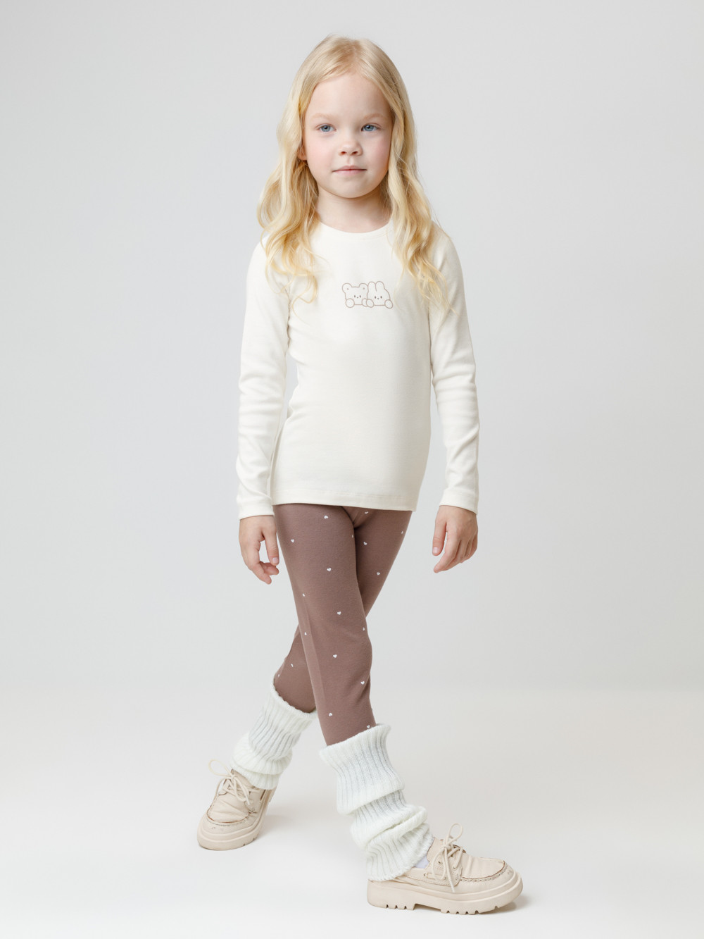 Тёплый лонгслив для девочки из мягкого трикотажа в рубчик с начёсом. Оригинальный принт выполнен из стойких текстильных гипоаллергенных красителей. Изделие сохраняет цвет и форму после многократных стирок. Все трикотажные полотна производятся в соответствии с нормами швейцарского сертификата ЭкоТекс.