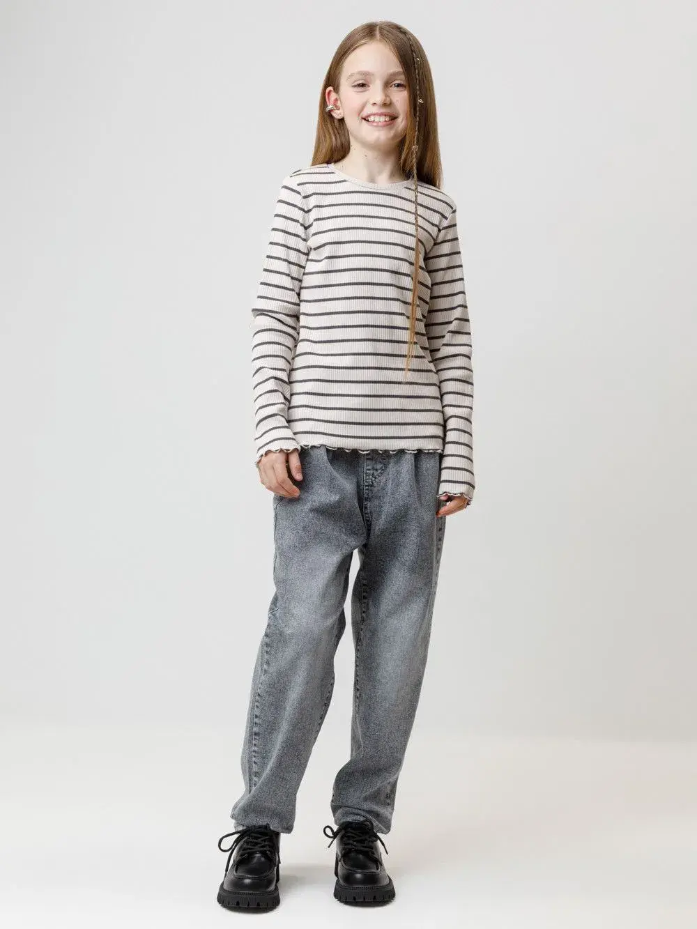 Лонгслив из эластичного трикотажа в рубчик для девочки. Оригинальный рисунок выполнен из стойких текстильных гипоаллергенных красителей. Изделие сохраняет цвет и форму после многократных стирок. Все трикотажные полотна производятся в соответствии с нормами швейцарского сертификата ЭкоТекс.