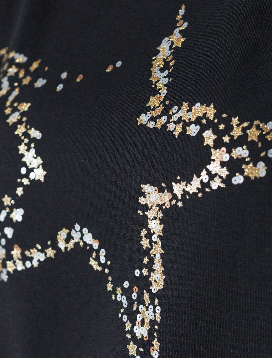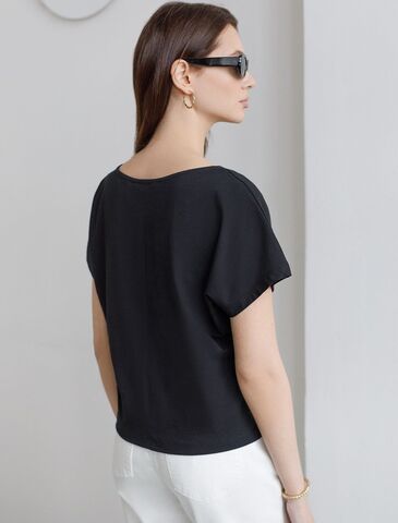 Футболка черного цвета идеально подходит для вечеринки и создания яркого образа. Оригинальный блестящий принт из фольги в виде звезды придает изделию шикарный вид, который привлечет внимание на любом мероприятии. Модель с вырезом лодочка и цельнокроеным рукавом обеспечивает свободу движений и комфорт в носке. Такой фасон изделия подходит на большие размеры, гармонично сидит на фигуре и помогает создать легкий акцент на достоинствах. Благодаря особенностям кроя с цельнокроеным рукавом удается искусно скроет любые возможные недостатки в области плеч и рук, обеспечивая комфортное прилегание без ощущения скованности. Аккуратный вырез лодочка красиво подчеркивает шею и делает образ элегантным, сохраняя актуальность для разных случаев — от рабочих встреч до вечерних прогулок и праздничных мероприятий.
