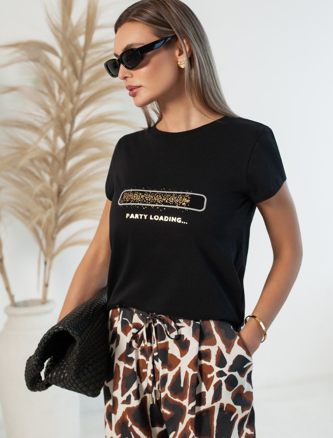 Футболка черного цвета идеально подходит для вечеринки и создания яркого образа. Оригинальный принт из золотистой фольги придает изделию шикарный вид, который привлечет внимание на любом мероприятии. Модель с круглым вырезом и классическим коротким рукавом обеспечивает свободу движений и комфорт в носке. Такой фасон изделия подходит на большие размеры, гармонично сидит на фигуре и помогает создать легкий акцент на достоинствах. Аккуратный круглый вырез красиво подчеркивает шею и делает образ элегантным, сохраняя актуальность для разных случаев — от рабочих встреч до вечерних прогулок и праздничных мероприятий.