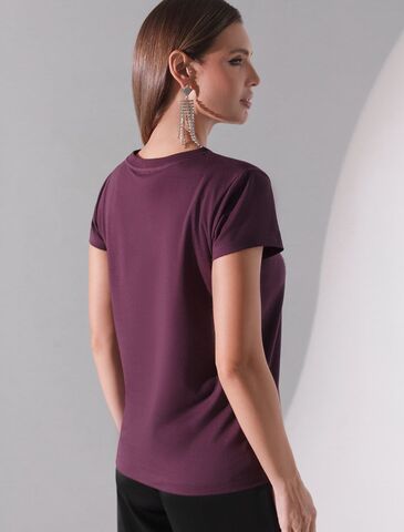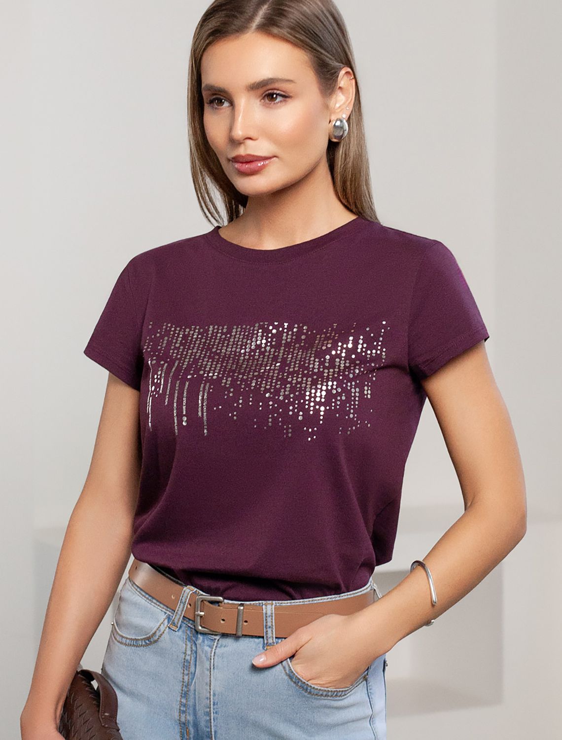 Футболка цвета бургунди идеально подходит для вечеринки и создания яркого образа. Оригинальный принт из серебристой фольги придает изделию шикарный вид, который привлечет внимание на любом мероприятии. Модель с круглым вырезом и классическим коротким рукавом обеспечивает свободу движений и комфорт в носке. Такой фасон изделия подходит на большие размеры, гармонично сидит на фигуре и помогает создать легкий акцент на достоинствах. Аккуратный круглый вырез красиво подчеркивает шею и делает образ элегантным, сохраняя актуальность для разных случаев — от рабочих встреч до вечерних прогулок и праздничных мероприятий.