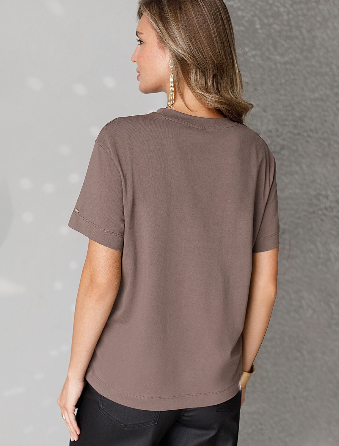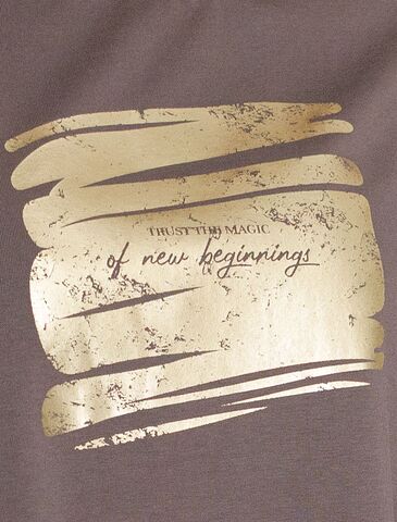 Стильная базовая футболка кофейного цвета с золотистым принтом фольгой выполнена из плотного хлопка с эластаном для комфортной посадки на любую фигуру. Прямая футболка классического кроя с круглым вырезом, прекрасно подходит для разных типов фигуры, в том числе и на большие размеры. Мягкость хлопка вместе с небольшой долей эластана гарантирует идеальную посадку и свободу движений. Легкая натуральная дышащая ткань премиального качества делает футболку с коротким рукавом идеальным вариантом для повседневной носки дома, на работу или офис. Однотонная футболка дополнена авторским аккуратным принтом с минималистичной надписью, который придает праздничный и элегантный вид без лишней вычурности. Блестящий принт аккуратно украшает, добавляя изысканный акцент и создавая легкий мерцающий эффект. Перевод надписи Trust the magic of new beginnings - Доверьтесь магии новых начинаний.