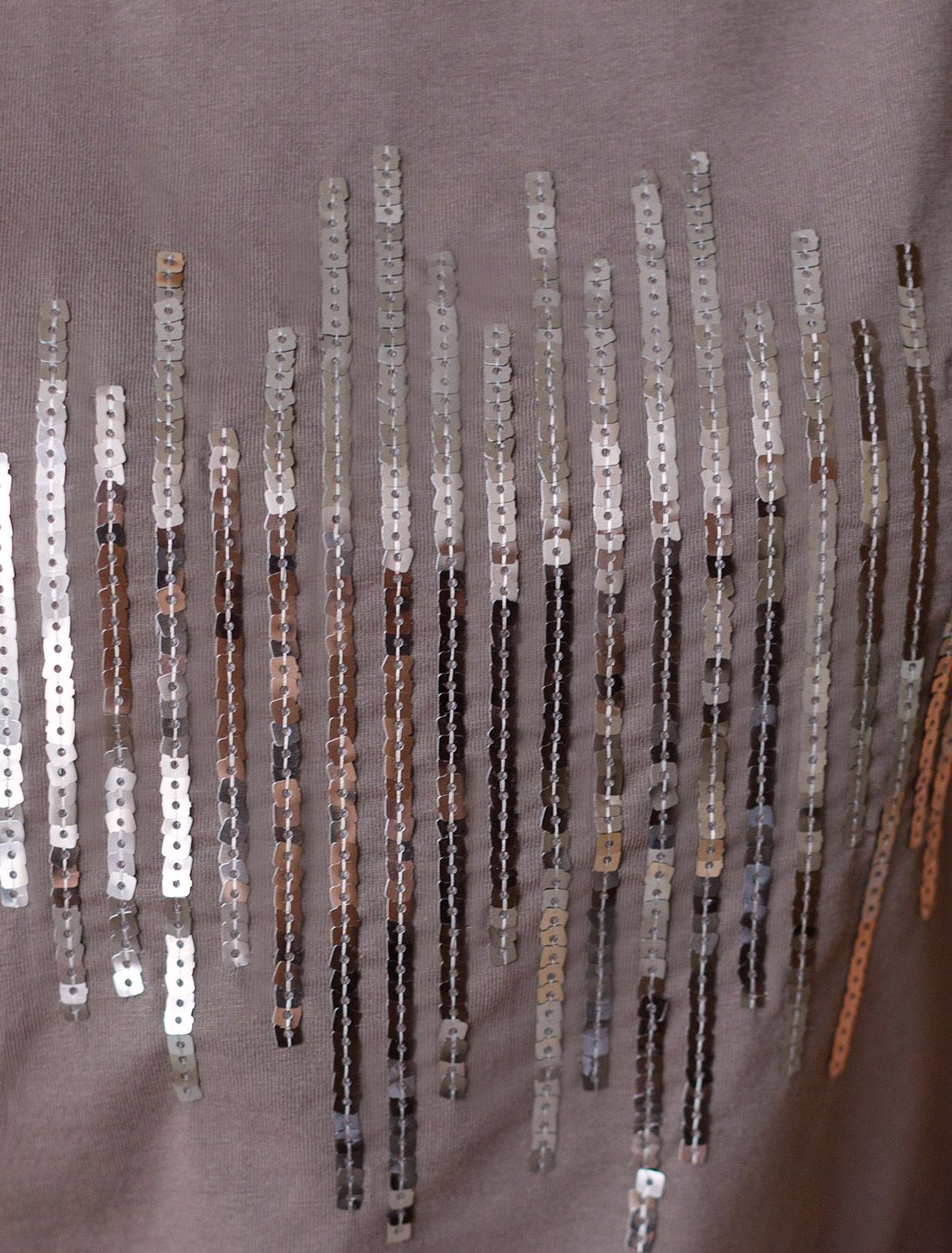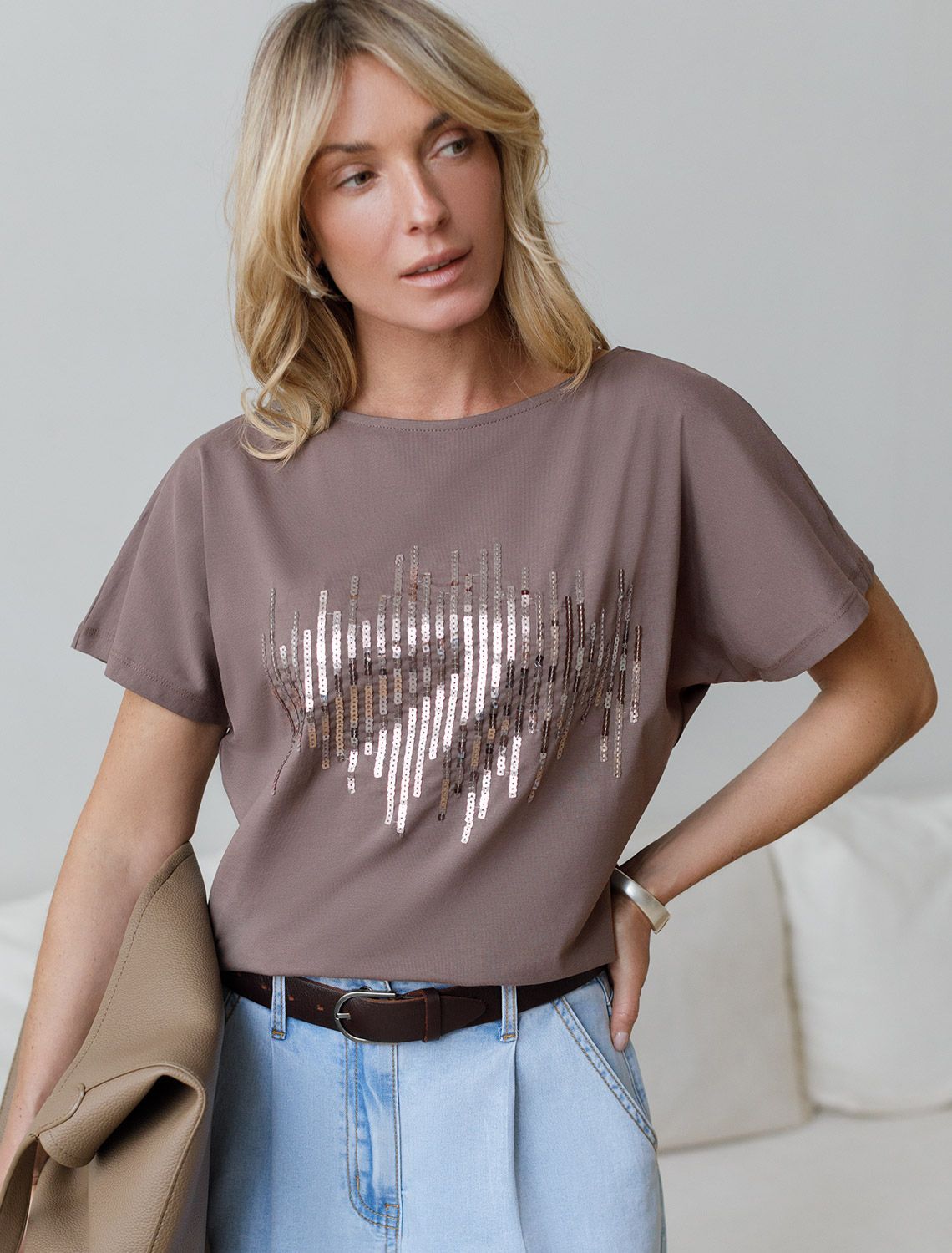 Футболка кофейного цвета идеально подходит для вечеринки и создания яркого образа. Оригинальный принт из блестящих пайеток в виде дождика придает изделию шикарный вид, который привлечет внимание на любом мероприятии. Модель с вырезом лодочка и цельнокроеным рукавом обеспечивает свободу движений и комфорт в носке. Такой фасон изделия подходит на большие размеры, гармонично сидит на фигуре и помогает создать легкий акцент на достоинствах. Благодаря особенностям кроя с цельнокроеным рукавом удается искусно скроет любые возможные недостатки в области плеч и рук, обеспечивая комфортное прилегание без ощущения скованности. Аккуратный вырез лодочка красиво подчеркивает шею и делает образ элегантным, сохраняя актуальность для разных случаев — от рабочих встреч до вечерних прогулок и праздничных мероприятий.