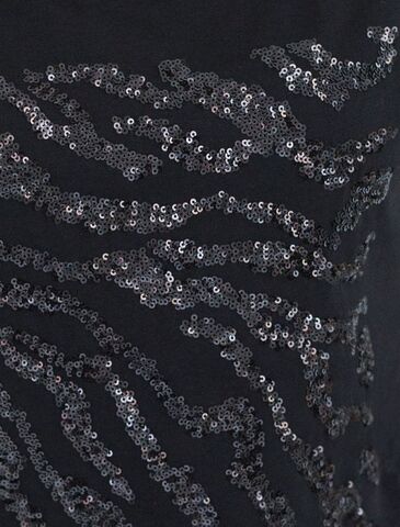 Футболка черного цвета идеально подходит для вечеринки и создания яркого образа. Оригинальный блестящий принт из пайеток в виде зебры придает изделию шикарный вид, который привлечет внимание на любом мероприятии. Модель с вырезом лодочка и цельнокроеным коротким рукавом обеспечивает свободу движений и комфорт в носке. Такой фасон изделия подходит на большие размеры, гармонично сидит на фигуре и помогает создать легкий акцент на достоинствах. Аккуратный вырез лодочка красиво подчеркивает шею и делает образ элегантным, сохраняя актуальность для разных случаев — от рабочих встреч до вечерних прогулок и праздничных мероприятий.