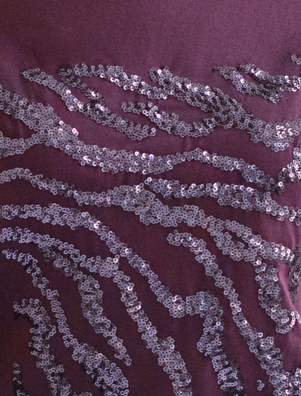 Футболка цвета бургунди идеально подходит для вечеринки и создания яркого образа. Оригинальный блестящий принт из пайеток серебристого цвета в виде зебры придает изделию шикарный вид, который привлечет внимание на любом мероприятии. Модель с вырезом лодочка и цельнокроеным коротким рукавом обеспечивает свободу движений и комфорт в носке. Такой фасон изделия подходит на большие размеры, гармонично сидит на фигуре и помогает создать легкий акцент на достоинствах. Аккуратный вырез лодочка красиво подчеркивает шею и делает образ элегантным, сохраняя актуальность для разных случаев — от рабочих встреч до вечерних прогулок и праздничных мероприятий.