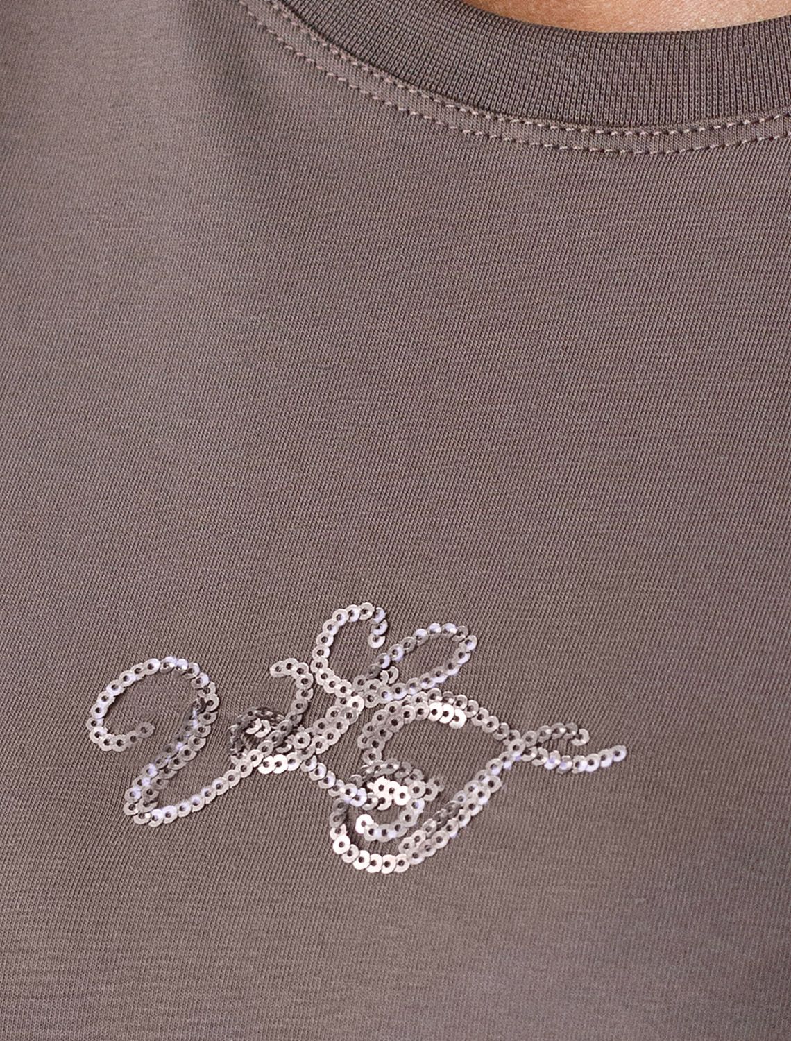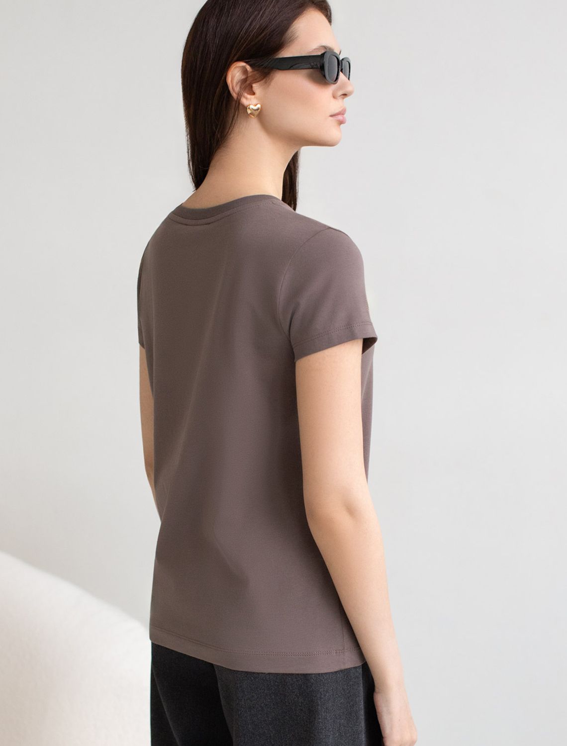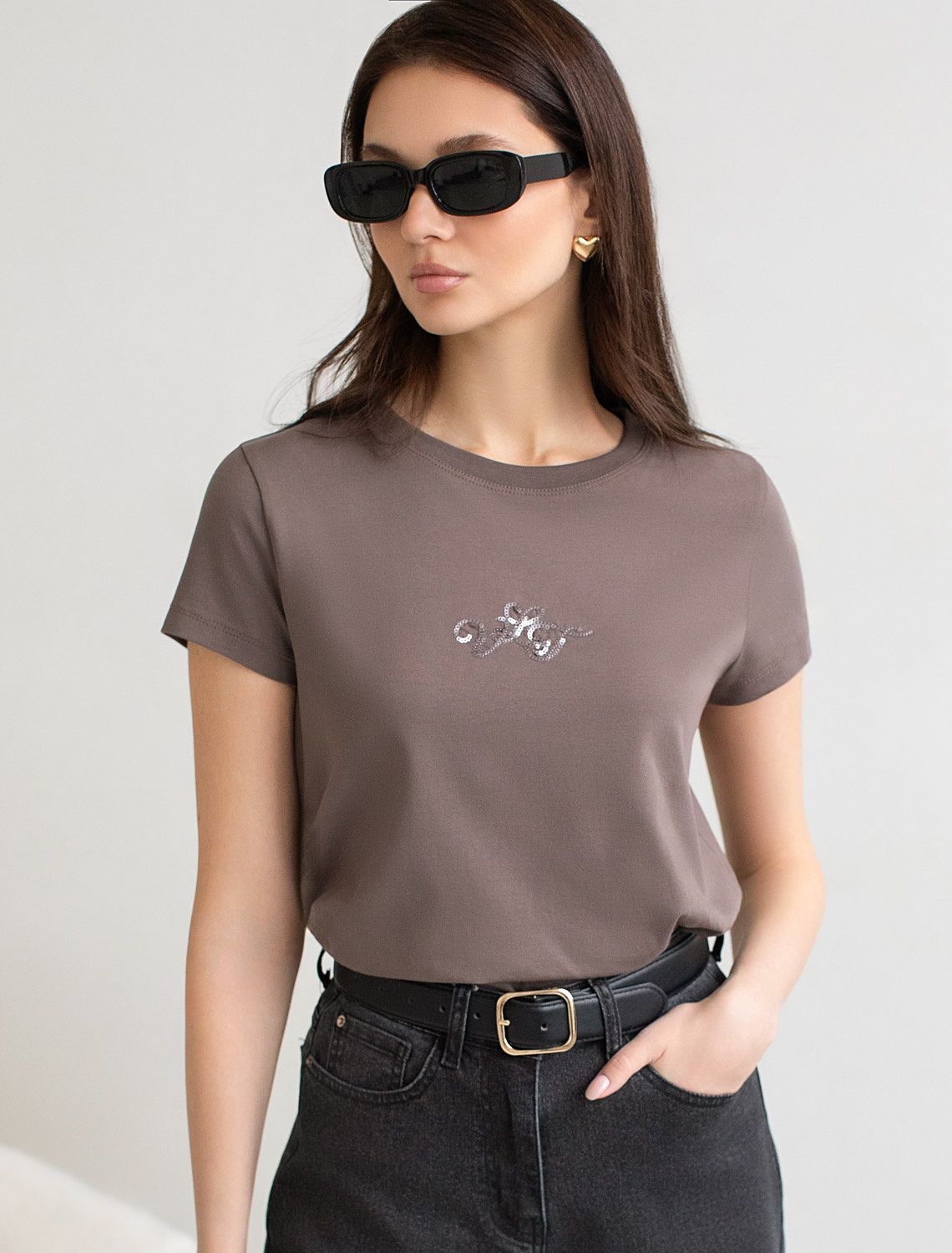 Стильная базовая футболка кофейного цвета с серебристым принтом пайетками выполнена из плотного хлопка с эластаном для комфортной посадки на любую фигуру. Прямая футболка классического кроя с круглым вырезом, прекрасно подходит для разных типов фигуры, в том числе и на большие размеры. Мягкость хлопка вместе с небольшой долей эластана гарантирует идеальную посадку и свободу движений. Легкая натуральная дышащая ткань премиального качества делает футболку с коротким рукавом идеальным вариантом для повседневной носки дома, на работу или офис. Однотонная футболка дополнена авторским аккуратным принтом, который придает праздничный и элегантный вид без лишней вычурности. Блестящий принт аккуратно украшает, добавляя изысканный акцент и создавая легкий мерцающий эффект.