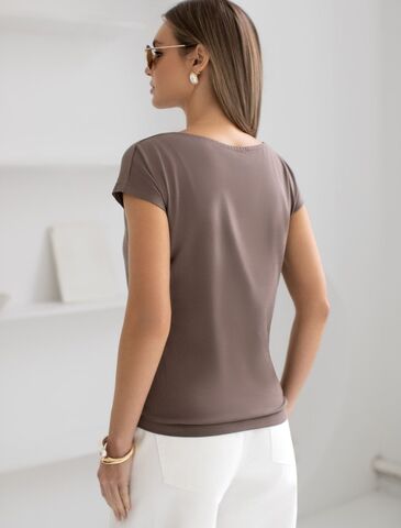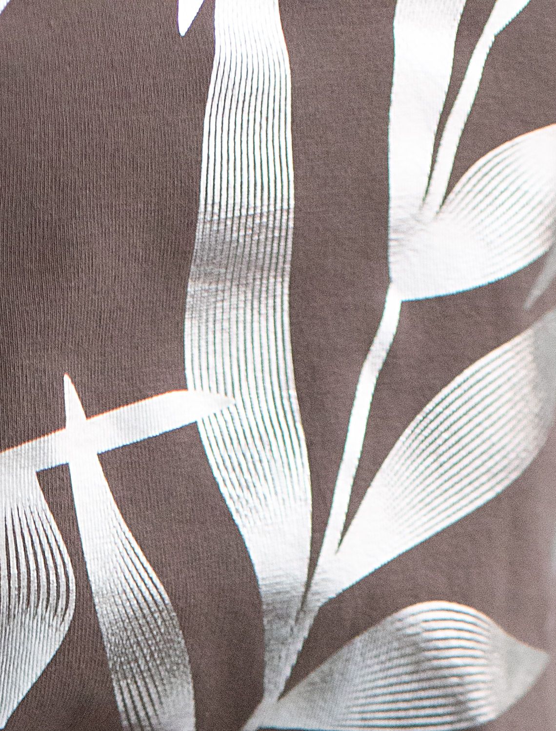 Футболка кофейного цвета идеально подходит для вечеринки и создания яркого образа. Оригинальный блестящий принт из устойчивой фольги в виде серебристых листиков придает изделию шикарный вид, который привлечет внимание на любом мероприятии. Модель с вырезом лодочка и цельнокроеным коротким рукавом обеспечивает свободу движений и комфорт в носке. Такой фасон изделия подходит на большие размеры, гармонично сидит на фигуре и помогает создать легкий акцент на достоинствах. Аккуратный вырез лодочка красиво подчеркивает шею и делает образ элегантным, сохраняя актуальность для разных случаев — от рабочих встреч до вечерних прогулок и праздничных мероприятий.