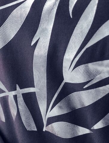 Футболка темно-синего цвета идеально подходит для вечеринки и создания яркого образа. Оригинальный блестящий принт из фольги серебристого цвета в виде листиков придает изделию шикарный вид, который привлечет внимание на любом мероприятии. Модель с вырезом лодочка и цельнокроеным коротким рукавом обеспечивает свободу движений и комфорт в носке. Такой фасон изделия подходит на большие размеры, гармонично сидит на фигуре и помогает создать легкий акцент на достоинствах. Аккуратный вырез лодочка красиво подчеркивает шею и делает образ элегантным, сохраняя актуальность для разных случаев — от рабочих встреч до вечерних прогулок и праздничных мероприятий.