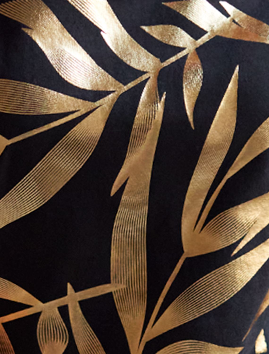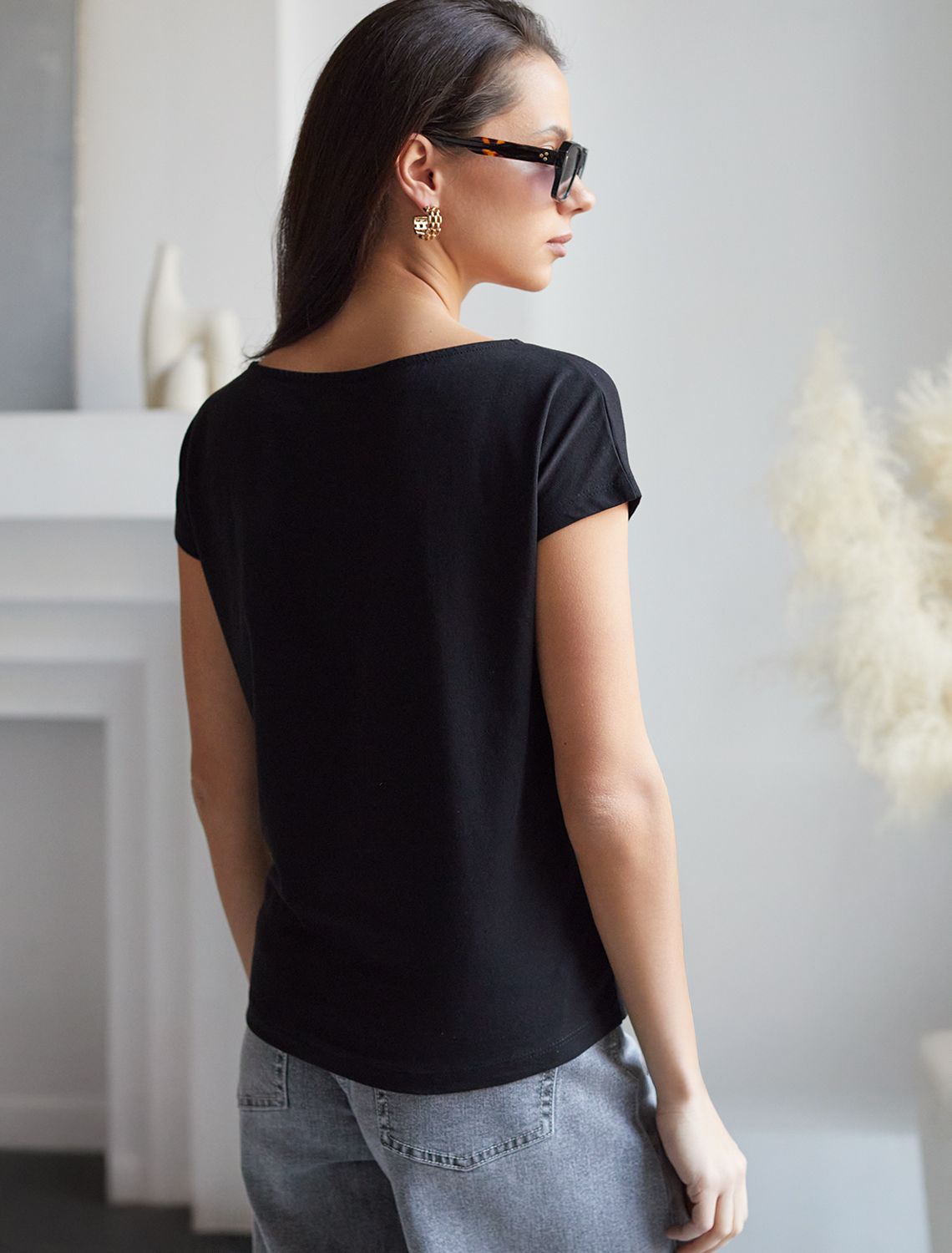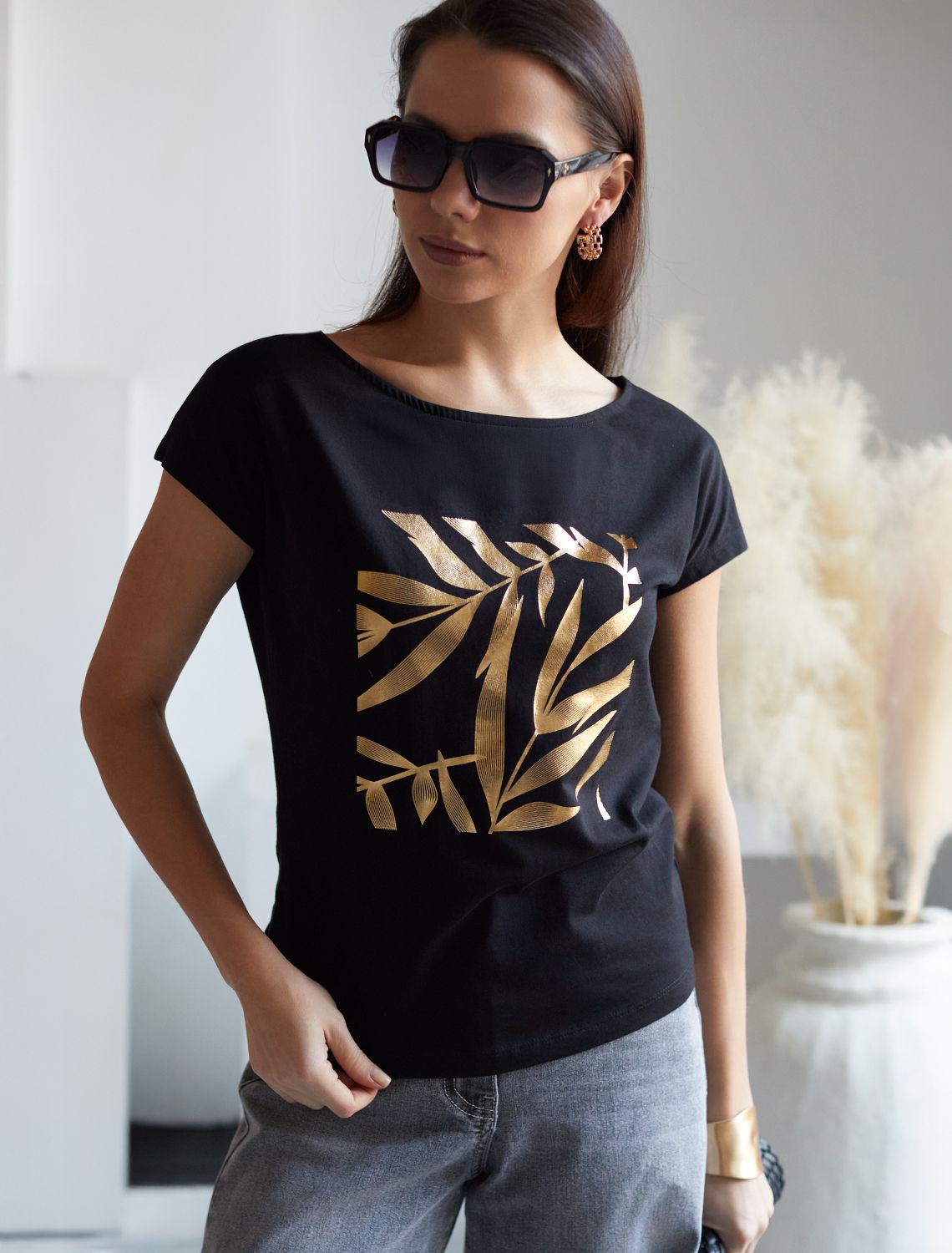 Футболка черного цвета идеально подходит для вечеринки и создания яркого образа. Оригинальный блестящий принт из устойчивой фольги в виде золотых листиков придает изделию шикарный вид, который привлечет внимание на любом мероприятии. Модель с вырезом лодочка и цельнокроеным коротким рукавом обеспечивает свободу движений и комфорт в носке. Такой фасон изделия подходит на большие размеры, гармонично сидит на фигуре и помогает создать легкий акцент на достоинствах. Аккуратный вырез лодочка красиво подчеркивает шею и делает образ элегантным, сохраняя актуальность для разных случаев — от рабочих встреч до вечерних прогулок и праздничных мероприятий.