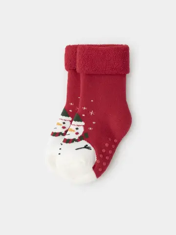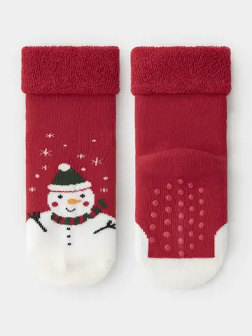 Тёплые махровые носки с формованной пяткой и отворотом по краю. На подошве резиновые стопперы. Украшены рисунком. Отлично подойдут для создания праздничных образов или как дополнение к подарку на Новый год и Рождество. Изделие сохраняет форму и стойкий цвет после многочисленных стирок.