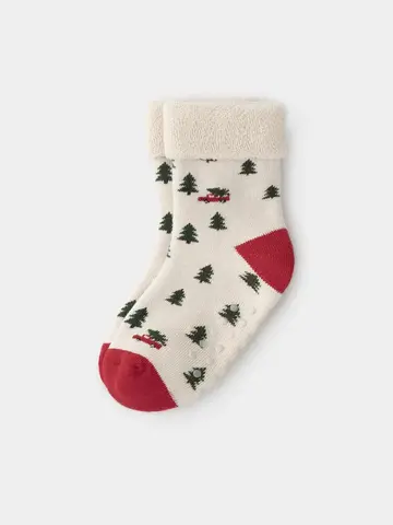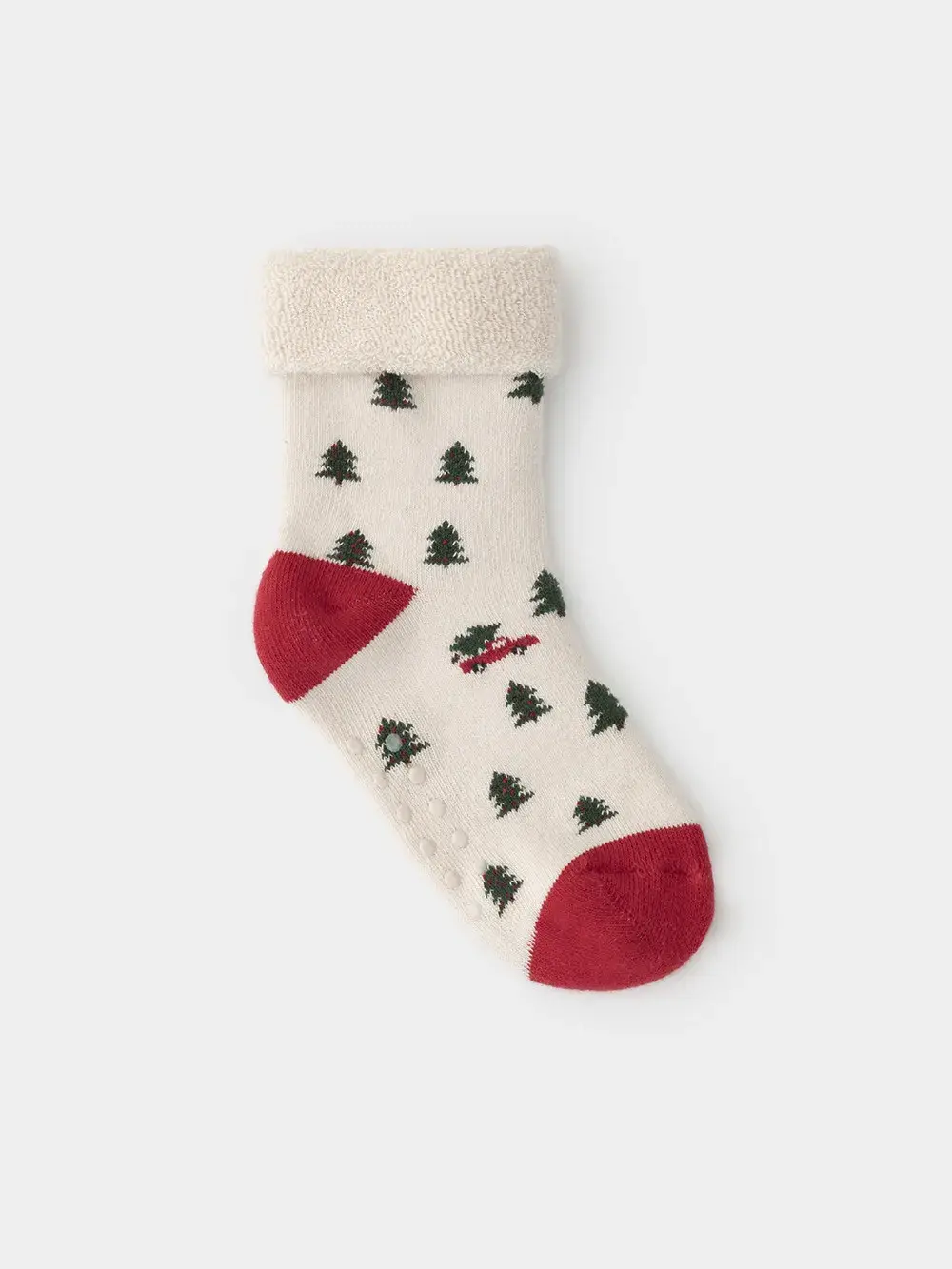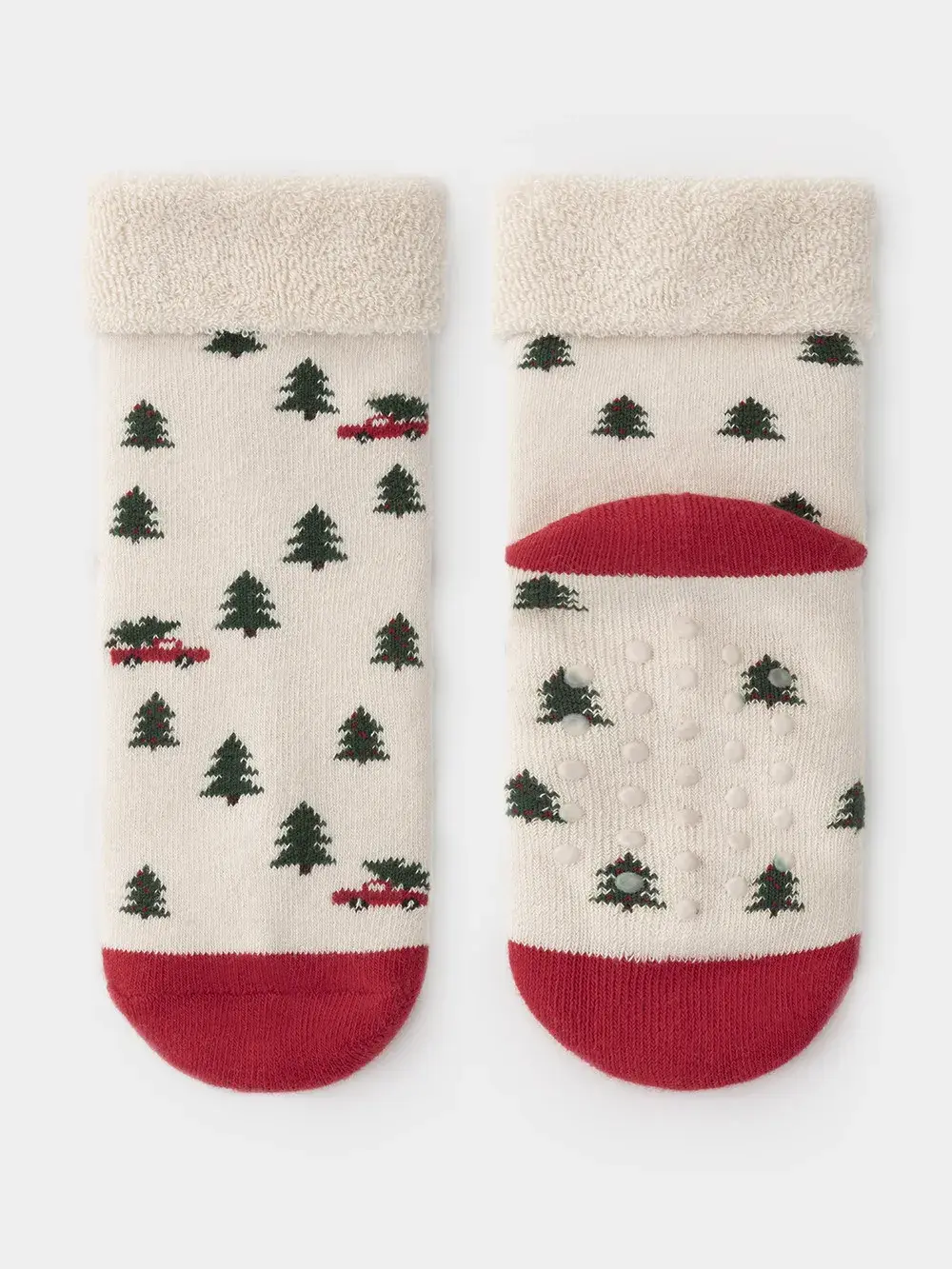 Тёплые махровые носки с формованной пяткой и отворотом по краю. На подошве резиновые стопперы. Украшены рисунком. Отлично подойдут для создания праздничных образов или как дополнение к подарку на Новый год и Рождество. Изделие сохраняет форму и стойкий цвет после многочисленных стирок.