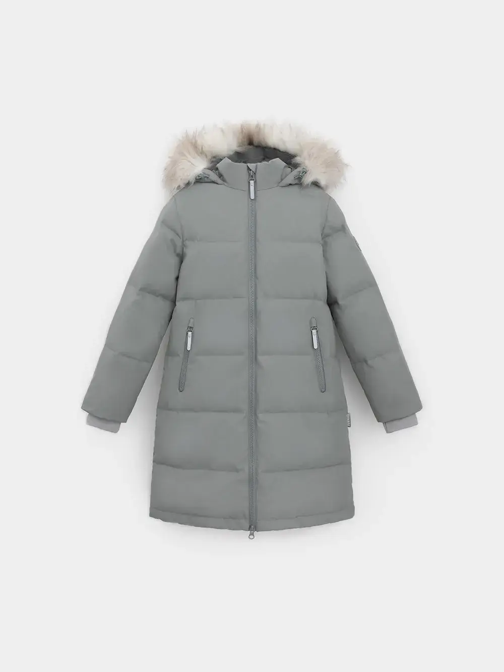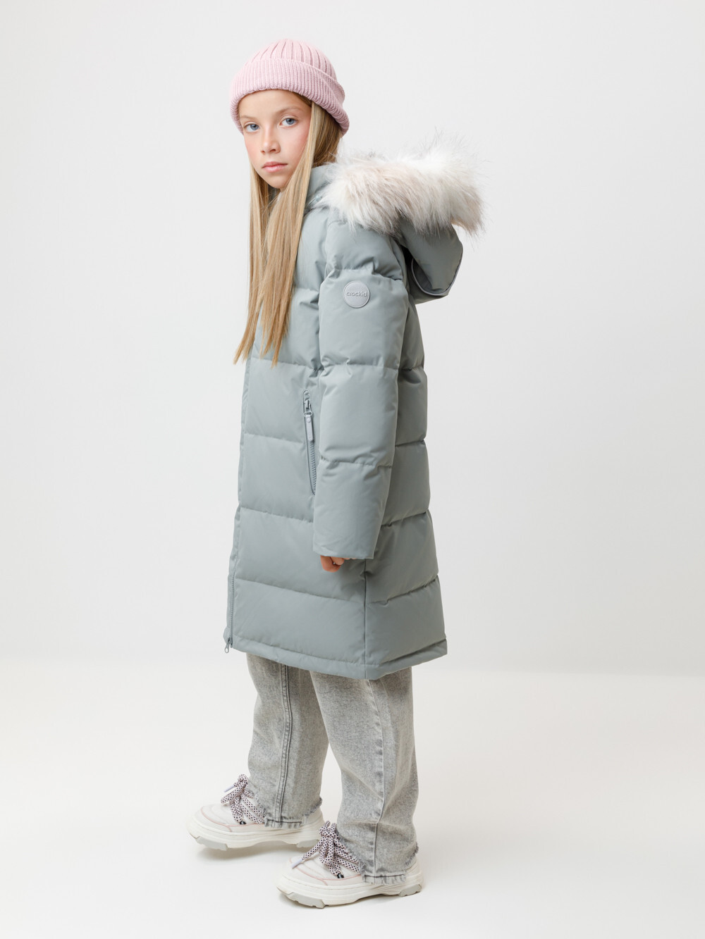 Зимнее пальто для девочки с натуральным утеплителем из гусиного пуха (70%) и пера (30%). Выполнено из мембранной ткани с дополнительной тефлоновой обработкой, которая предохраняет изделие от загрязнений и отталкивает влагу. Подклад выполнен из 100% полиэстера. Пальто застёгивается на молнию, предусмотрена защита подбородка. Несъёмный капюшон имеет эластичные утяжки и отстёгивающийся искусственный мех. По бокам два кармана на молнии. В рукавах мягкие внутренние манжеты. Во всех изделиях верхнего ассортимента для безопасности ребёнка предусмотрены светоотражающие элементы.