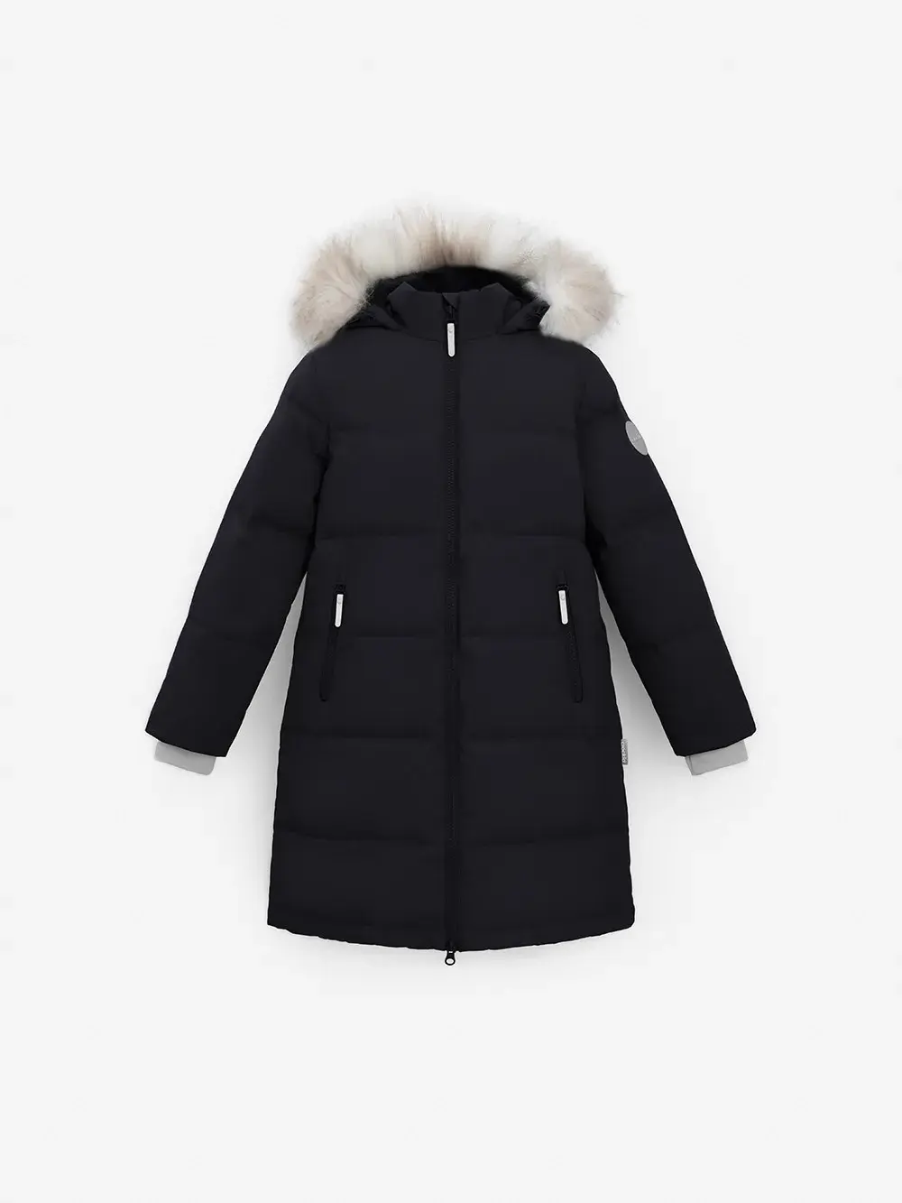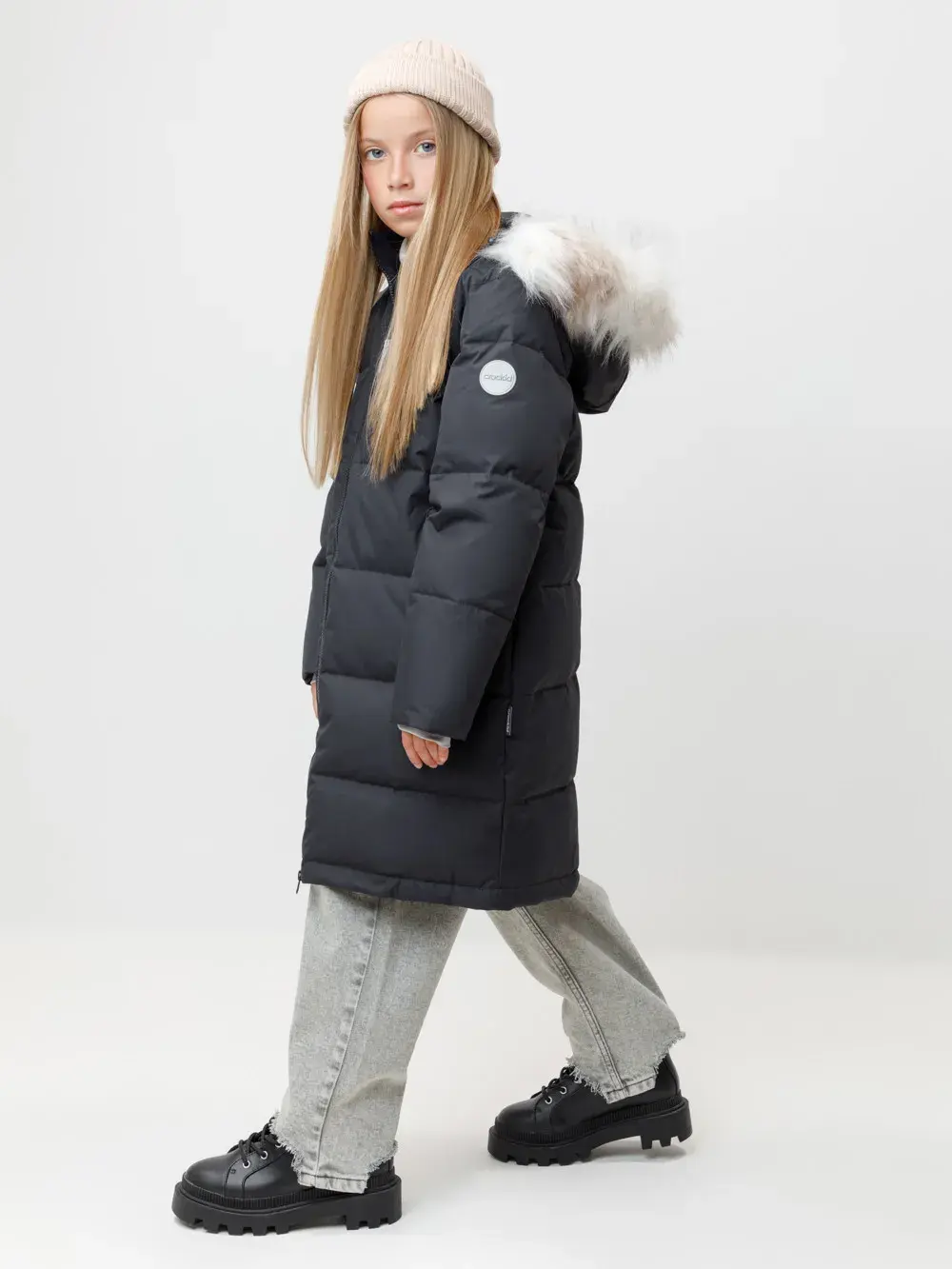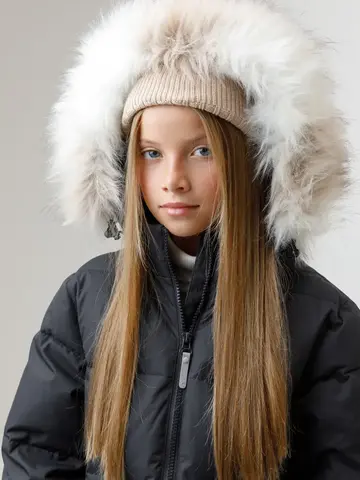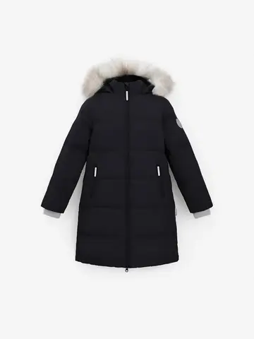 Зимнее пальто для девочки с натуральным утеплителем из гусиного пуха (70%) и пера (30%). Выполнено из мембранной ткани с дополнительной тефлоновой обработкой, которая предохраняет изделие от загрязнений и отталкивает влагу. Подклад выполнен из 100% полиэстера. Пальто застёгивается на молнию, предусмотрена защита подбородка. Несъёмный капюшон имеет эластичные утяжки и отстёгивающийся искусственный мех. По бокам два кармана на молнии. В рукавах мягкие внутренние манжеты. Во всех изделиях верхнего ассортимента для безопасности ребёнка предусмотрены светоотражающие элементы.