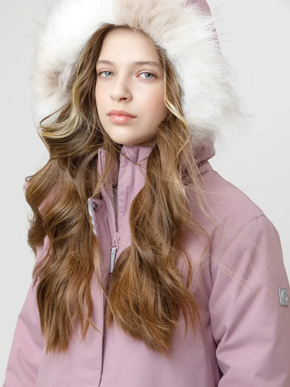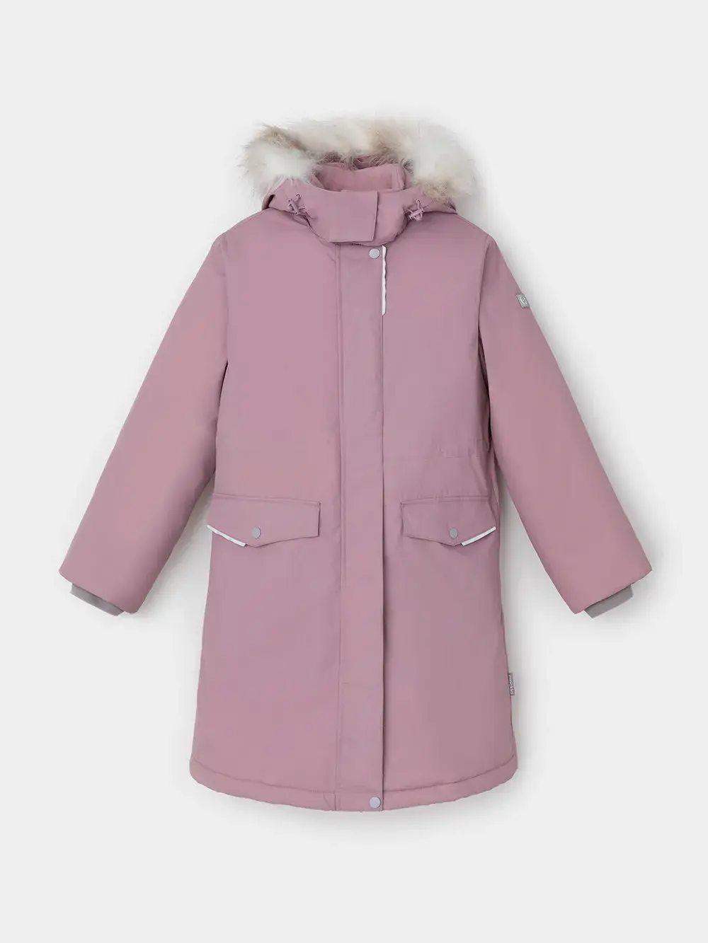 Зимнее пальто для девочки с утеплителем SEE®: 250 г/м2. Выполнено из мембранной ткани с дополнительной тефлоновой обработкой, которая предохраняет изделие от загрязнений и отталкивает влагу. Подклад выполнен из 100% полиэстера Tricot. Пальто застёгивается на молнию, предусмотрена защита подбородка. Съёмный капюшон на кнопках и липучках имеет отстёгивающийся искусственный мех. На рукавах мягкие манжеты. По бокам два кармана с клапанами, внутри карман на молнии. По талии эластичная утяжка со стопперами для регулировки ширины пальто. Во всех изделиях верхнего ассортимента для безопасности ребёнка предусмотрены светоотражающие элементы.