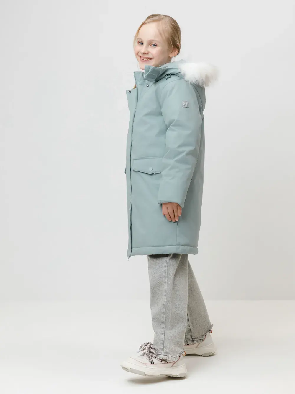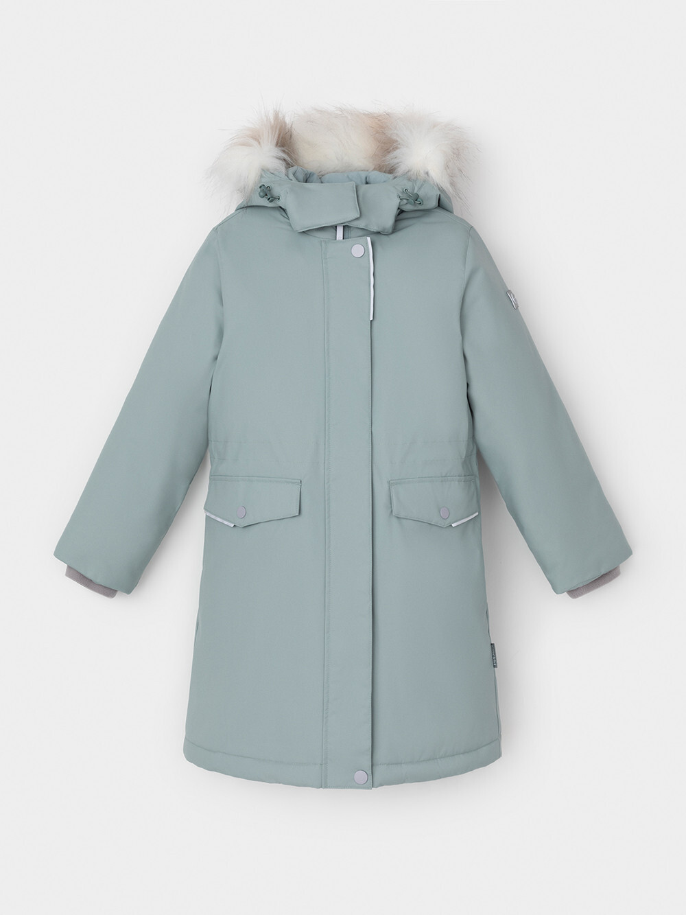 Зимнее пальто для девочки с утеплителем SEE®: 250 г/м2. Выполнено из мембранной ткани с дополнительной тефлоновой обработкой, которая предохраняет изделие от загрязнений и отталкивает влагу. Подклад выполнен из 100% полиэстера Tricot. Пальто застёгивается на молнию, предусмотрена защита подбородка. Съёмный капюшон на кнопках и липучках имеет отстёгивающийся искусственный мех. На рукавах мягкие манжеты. По бокам два кармана с клапанами, внутри карман на молнии. По талии эластичная утяжка со стопперами для регулировки ширины пальто. Во всех изделиях верхнего ассортимента для безопасности ребёнка предусмотрены светоотражающие элементы.