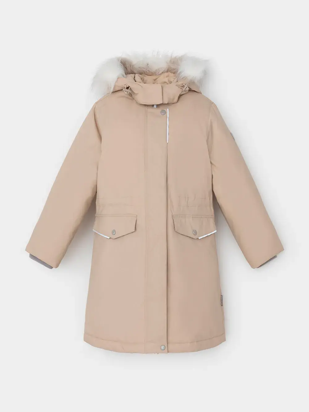 Зимнее пальто для девочки с утеплителем SEE®: 250 г/м2. Выполнено из мембранной ткани с дополнительной тефлоновой обработкой, которая предохраняет изделие от загрязнений и отталкивает влагу. Подклад выполнен из 100% полиэстера Tricot. Пальто застёгивается на молнию, предусмотрена защита подбородка. Съёмный капюшон на кнопках и липучках имеет отстёгивающийся искусственный мех. На рукавах мягкие манжеты. По бокам два кармана с клапанами, внутри карман на молнии. По талии эластичная утяжка со стопперами для регулировки ширины пальто. Во всех изделиях верхнего ассортимента для безопасности ребёнка предусмотрены светоотражающие элементы.