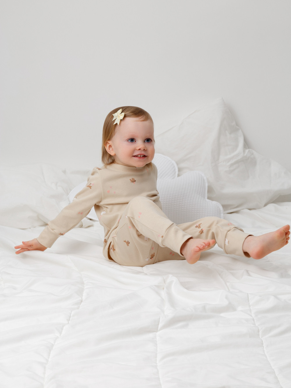 Трикотажная пижама из натурального хлопка. Джемпер с длинными втачными рукавами и брюки с эластичной резинкой в поясе. Мягкие манжеты на рукавах и по низу брюк. Оригинальная набивка выполнена из стойких текстильных гипоаллергенных красителей. Изделие сохраняет цвет и форму после многократных стирок. Все трикотажные полотна производятся в соответсвии с нормами швейцарского сертификата ЭкоТекс.