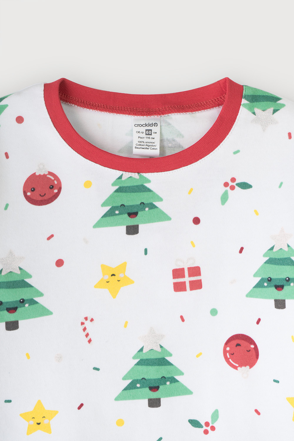 Трикотажный пижамный комплект из натурального хлопка. У джемпера длинные втачные рукава с мягкими манжетами. Брюки с удобным поясом на резинке и эластичными манжетами. Оригинальная набивка выполнена из стойких, гипоаллергенных текстильных красителей. Все трикотажные полотна производятся в соответствии с нормами Швейцарского сертификата ЭкоТекс.