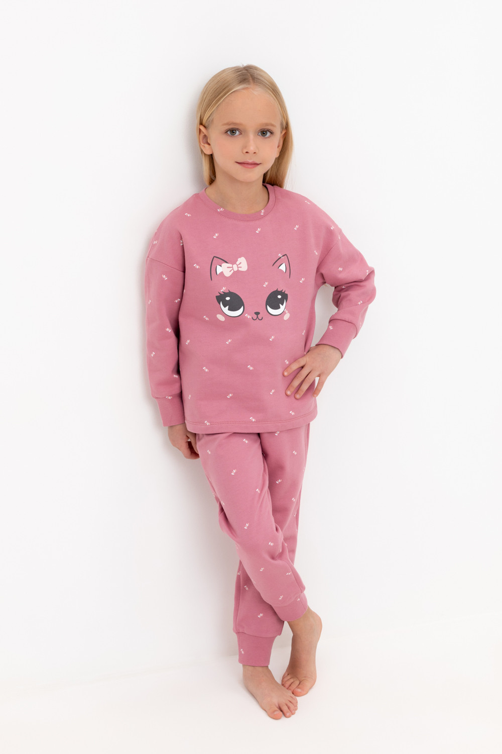 Тёплая пижама с начёсом из натурального хлопка. Джемпер с длинными спущенными рукавами и брюки с эластичной резинкой в поясе. Мягкие манжеты на рукавах и по низу брюк. Оригинальные набивка и принт выполнены из стойких гипоаллергенных текстильных красителей. Изделие сохраняет цвет и форму после многократных стирок. Все трикотажные полотна производятся в соответствии с нормами швейцарского сертификата ЭкоТекс.
