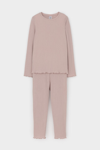 Трикотажная пижама в рубчик из натурального хлопка. Джемпер с длинными втачными рукавами. У лосин мягкий, эластичный пояс на резинке. Комплект сохраняет цвет и форму после многократных стирок. Все трикотажные полотна производятся в соответсвии с нормами Швейцарского сертификата ЭкоТекс.