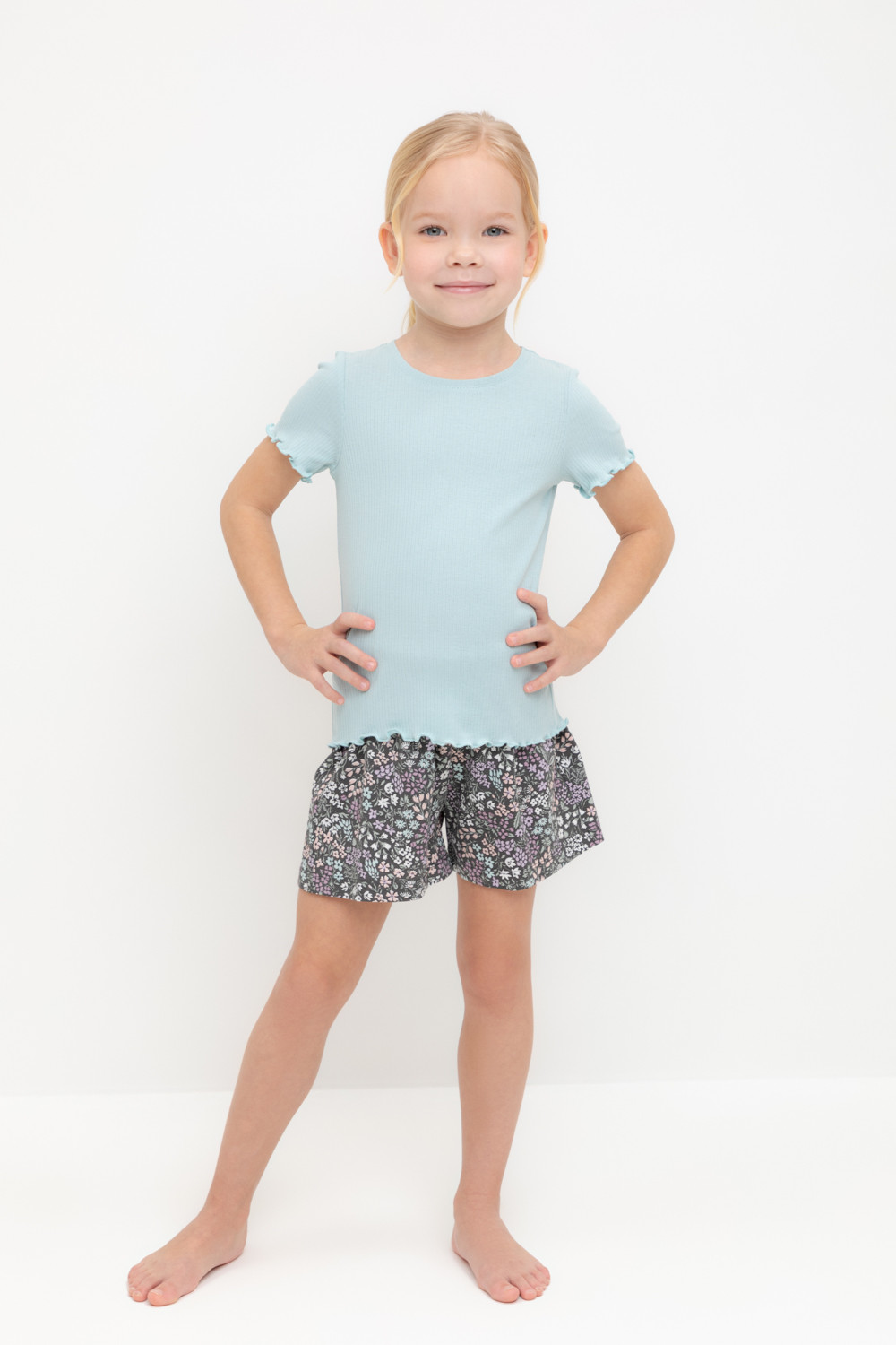 Трикотажная пижама из натурального хлопка. Футболка с короткими втачными рукавами изготовлена из эластичного трикотажа в рубчик. Шорты с эластичной резинкой в поясе выполнены из гладкого трикотажа супрем. Оригинальная набивка выполнена из стойких текстильных гипоаллергенных красителей. Изделие сохраняет цвет и форму после многократных стирок. Все трикотажные полотна производятся в соответсвии с нормами швейцарского сертификата ЭкоТекс.