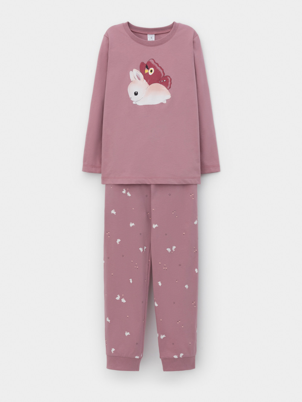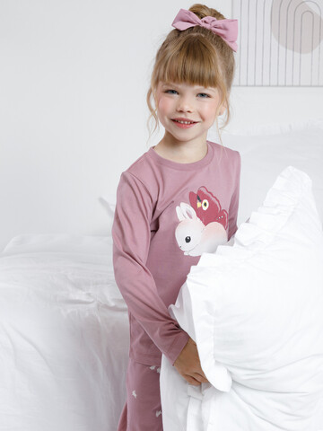 Пижама для девочки из натурального хлопка. Джемпер с длинными втачными рукавами и брюки с эластичной резинкой в поясе. Мягкие манжеты по низу брюк сделаны из материала в рубчик. Оригинальная набивка и принт выполнены из стойких текстильных гипоаллергенных красителей. Изделие сохраняет цвет и форму после многократных стирок. Все трикотажные полотна производятся в соответствии с нормами швейцарского сертификата ЭкоТекс.