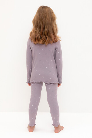 Трикотажная пижама в рубчик из натурального хлопка. Джемпер с длинными втачными рукавами и лосины с эластичной резинкой в поясе. Оригинальная набивка выполнена из стойких текстильных гипоаллергенных красителей. Изделие сохраняет цвет и форму после многократных стирок. Все трикотажные полотна производятся в соответствии с нормами швейцарского сертификата ЭкоТекс.